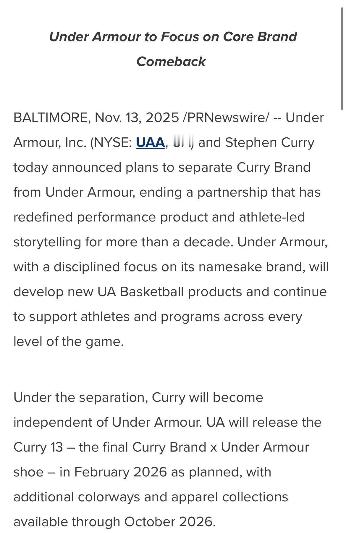 shams:斯蒂芬·库里与安德玛分道扬镳,结束了自 2013 年以来的长期合作关系。库里的个人品牌 Curry Brand 将继续独立运营。他与 Under Armour 合作的球鞋系列将按计划持续到 2026 年,但他和他的 Curry Brand 公司将进入球鞋自由市场。