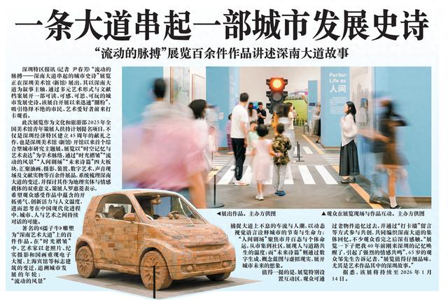 “流动的脉搏——深南大道串起的城市史诗”展览正在深圳美术馆(新馆)展出,其以深南大道为叙事主轴,通过多元艺术形式与文献档案展开一部可读、可感、可思、可玩的城市发展史诗。该展自开展以来迅速“圈粉”,吸引络绎不绝的市民、艺术爱好者前来打卡观看。