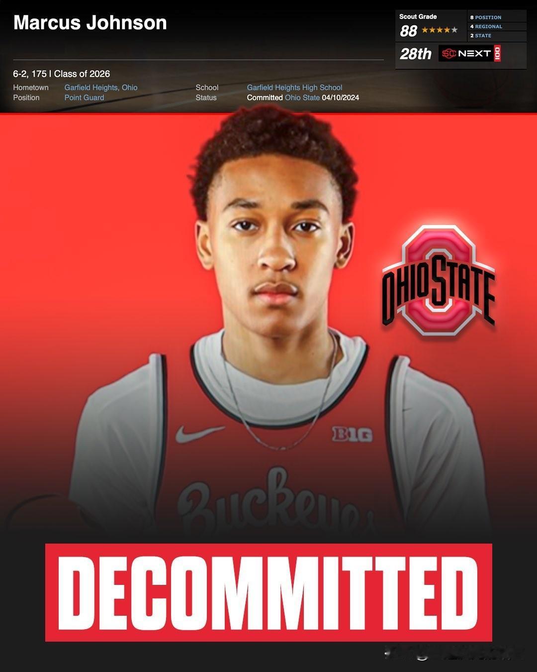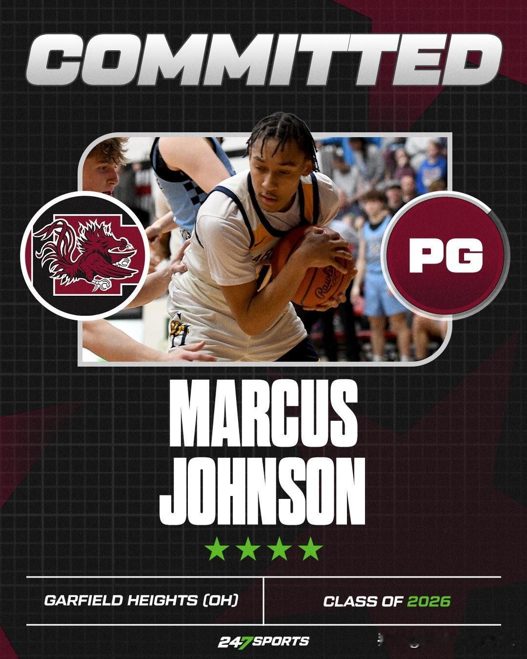 TOP35四星控卫Marcus Johnson宣布承诺NCAA男篮 南卡大学,上月反悔了家乡球队俄亥俄州立,高三赛季荣获俄亥俄州篮球先生,马库斯与父亲桑尼成为唯一获得该荣誉的父子档,就读于父亲Sonny Johnson执教的Garfield Heights高中,身高6-1=185,堂哥Meechie Johnson目前在南卡打球。 ​ ​​​