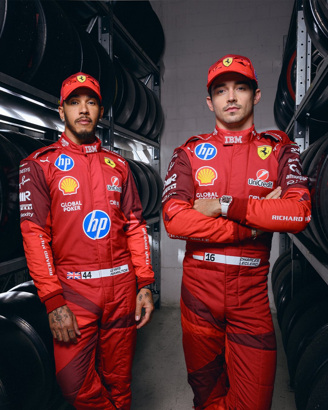 虎扑11月14日讯法拉利车队公布了F1拉斯维加斯大奖赛的特别版赛车服和赛车帽,纪念与服装赞助商的多年合作。两位车手汉密尔顿和勒克莱尔作为模特出镜。