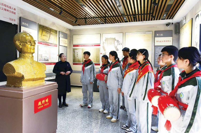 11月12日,阜阳市第十九中学新河校区组织师生代表到四九起义纪念馆,开展“寻根”主题活动。活动中,师生向纪念碑敬献花篮,参观纪念馆,缅怀先烈,表达哀思。图为学生听工作人员介绍魏野畴烈士事迹。
