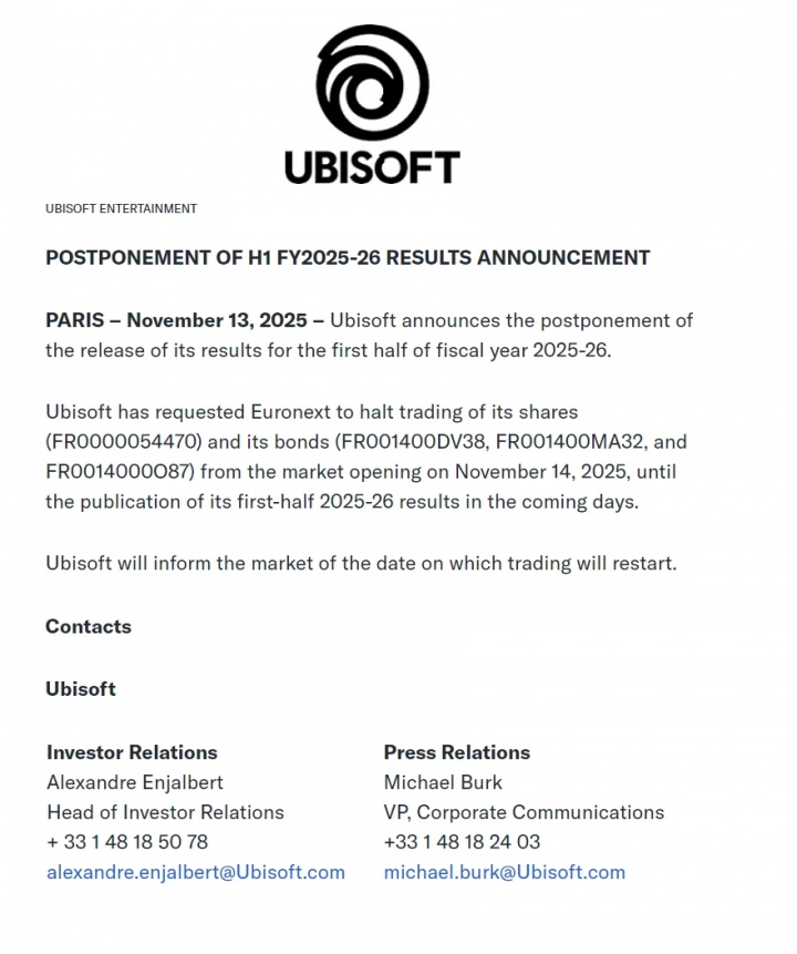 直播吧11月14日讯 据外媒报道,育碧今日突然发布公告,宣布推迟最新财报的公布,并且暂停了股票和债券的交易。具体公布财报时间和恢复交易时间待定。