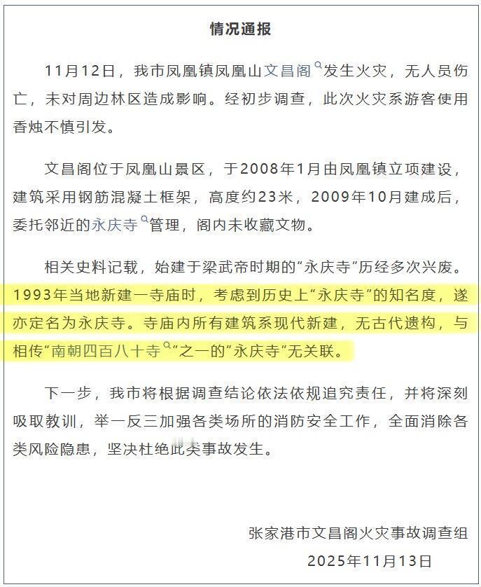 这事儿得给大家说清楚,张家港着火的那个文昌阁,根本不是什么千年古寺。 就前几天,凤凰山那个文昌阁烧了一把,好在没人伤亡,火也没蔓延到周围山上。官方调查结果出来了,就是有游客在里面烧香点烛不小心给引燃的。 得重点说说这个文昌阁的来历。它是2008年立项,2009年才建好的现代建筑,钢筋混凝土结构,就是个仿古的楼阁,里面也没放什么文物。建好之后交给边上的永庆寺管理。 说到这个永庆寺,也有必要掰扯明白。虽然历史上确实有个梁武帝时期建的“永庆寺”,但早就毁了多少回了。现在这个寺庙是1993年新建的,纯粹是借用了老名字,所有建筑都是现代的,跟古代那个“南朝四百八十寺”之一的寺庙没半点关系。 说白了,这次烧的就是个现代建的仿古楼,不是什么文物古迹。现在当地说了,要追究责任,以后也得加强消防,别再出这种事儿。 所以啊,大家出去游玩,尤其在木质结构或者这种仿古建筑里,用火用电真得万分小心。一个疏忽,就可能酿成大祸。