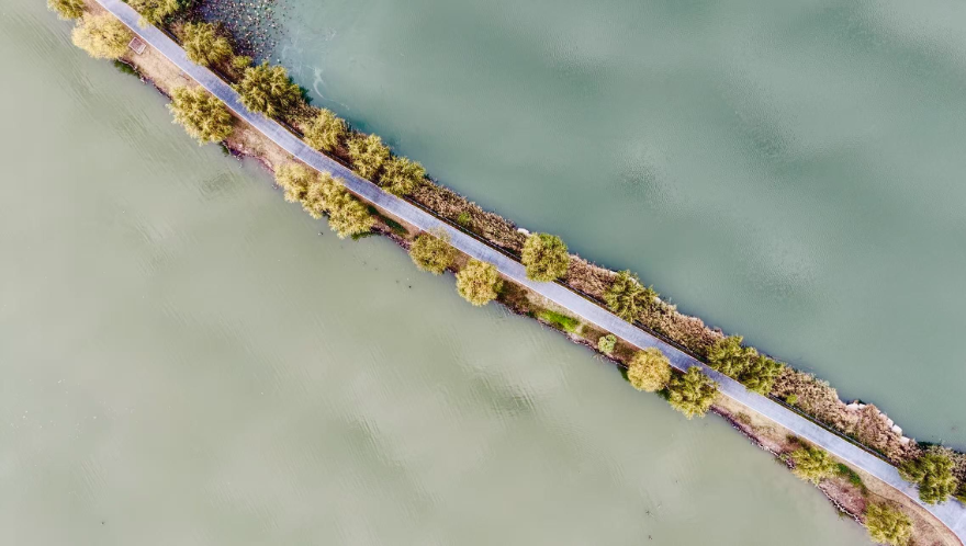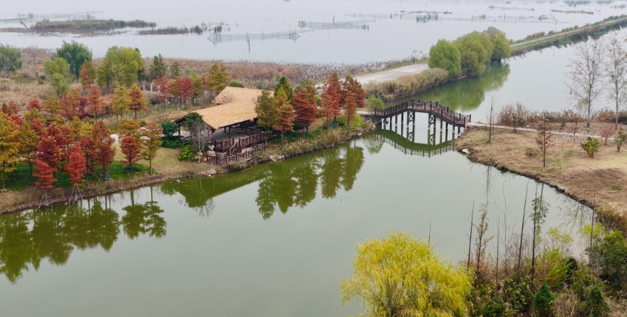 沿湖设有长约21公里的环湖步道和栈道,蜿蜒曲折,串联起多个景点。漫步其间,可近距离欣赏湖水、芦苇荡和岸边的树林,感受大自然的宁静与美好。转过弯到湿地展园,木栈道、观赏亭与高低错落的草坪相映成趣,藏着“探美景”的小惊喜。旁边的杨树林是老村落留下的,每棵树都承载着当地人的乡愁。不远处的“荷塘涟漪”,夏日荷叶田田,正是“深改湖,浅造田,不深不浅种藕莲”治理理念的生动体现。