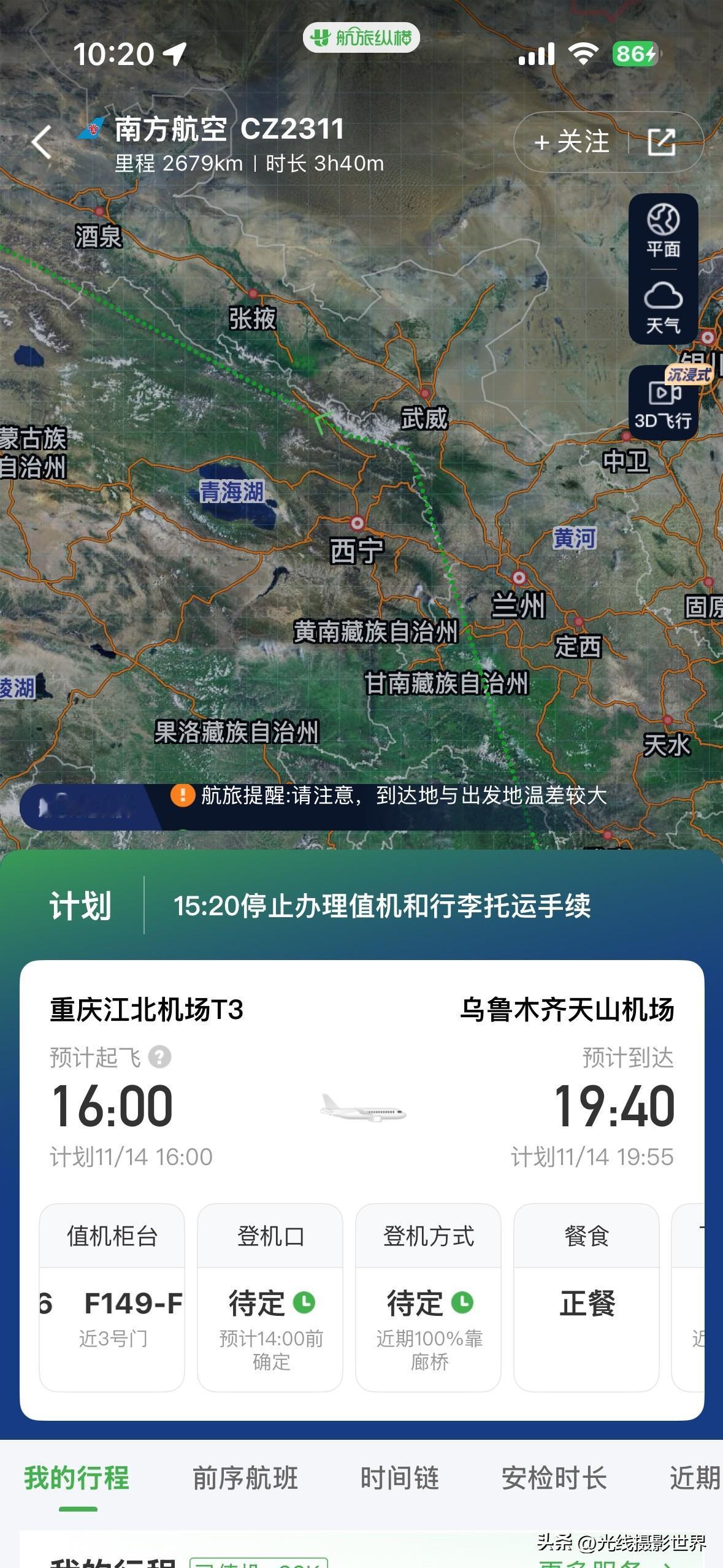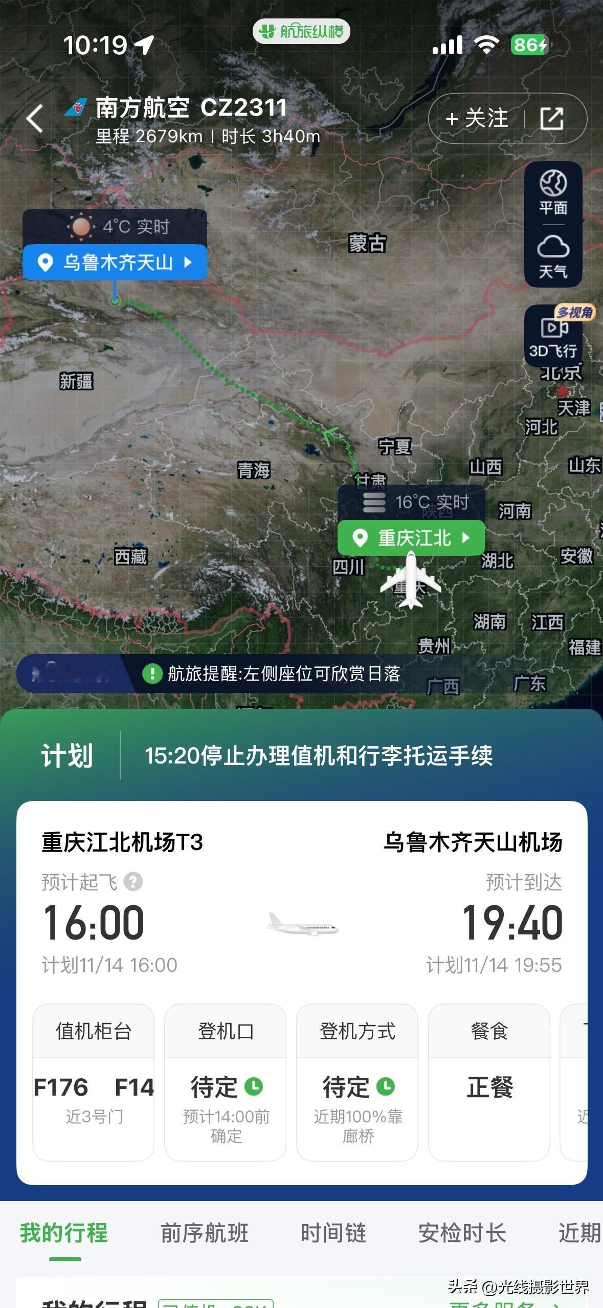 11月14日,星期五下午4点,我乘坐的南方航空CZ2311次航班将会从重庆江北机