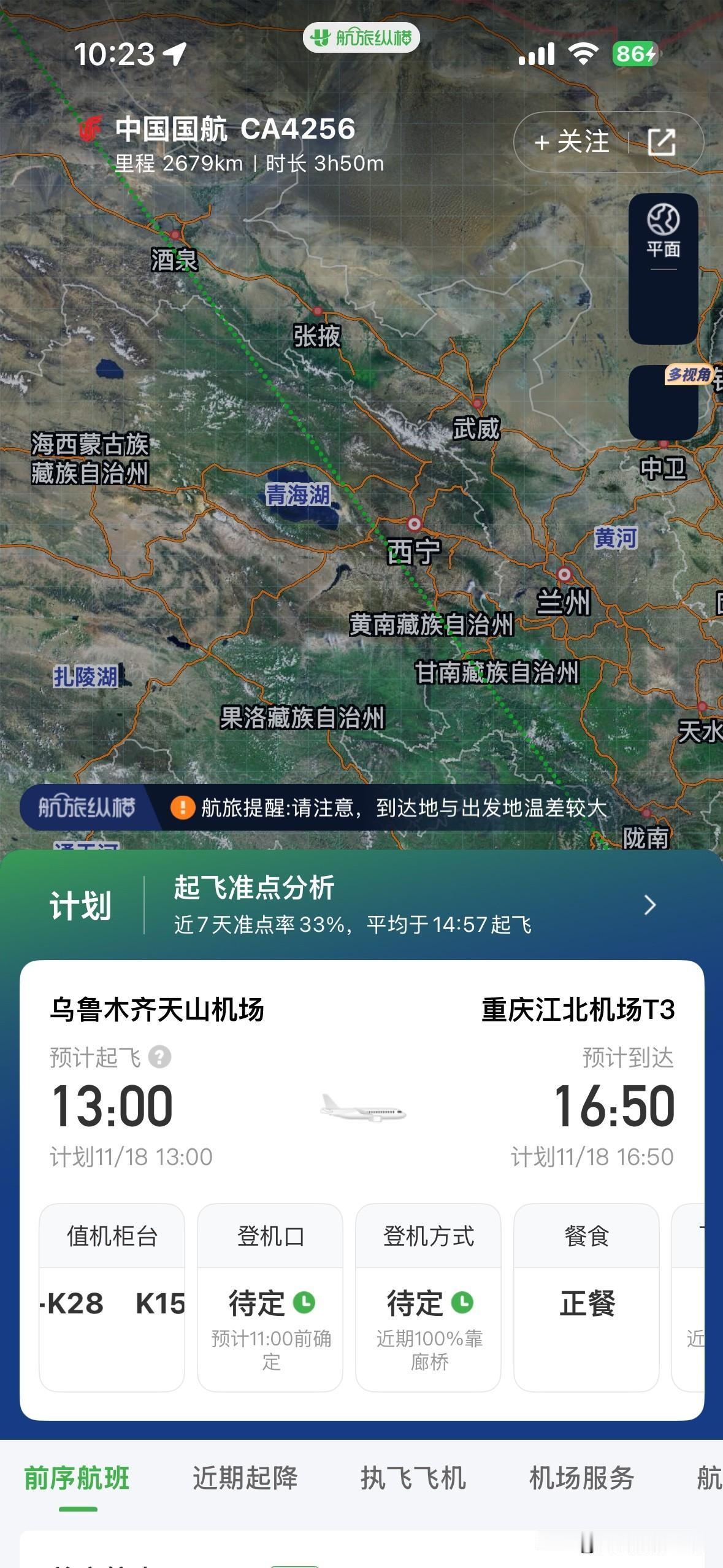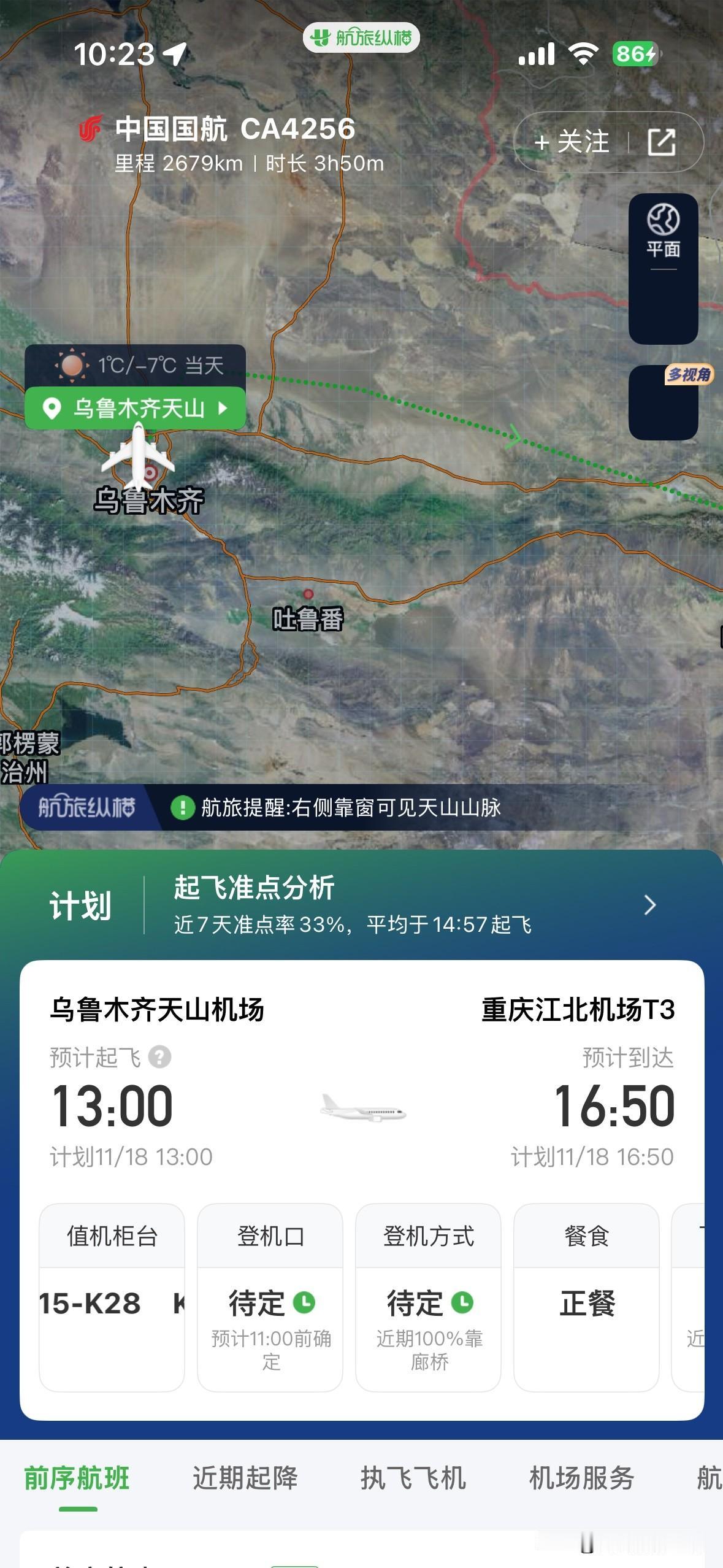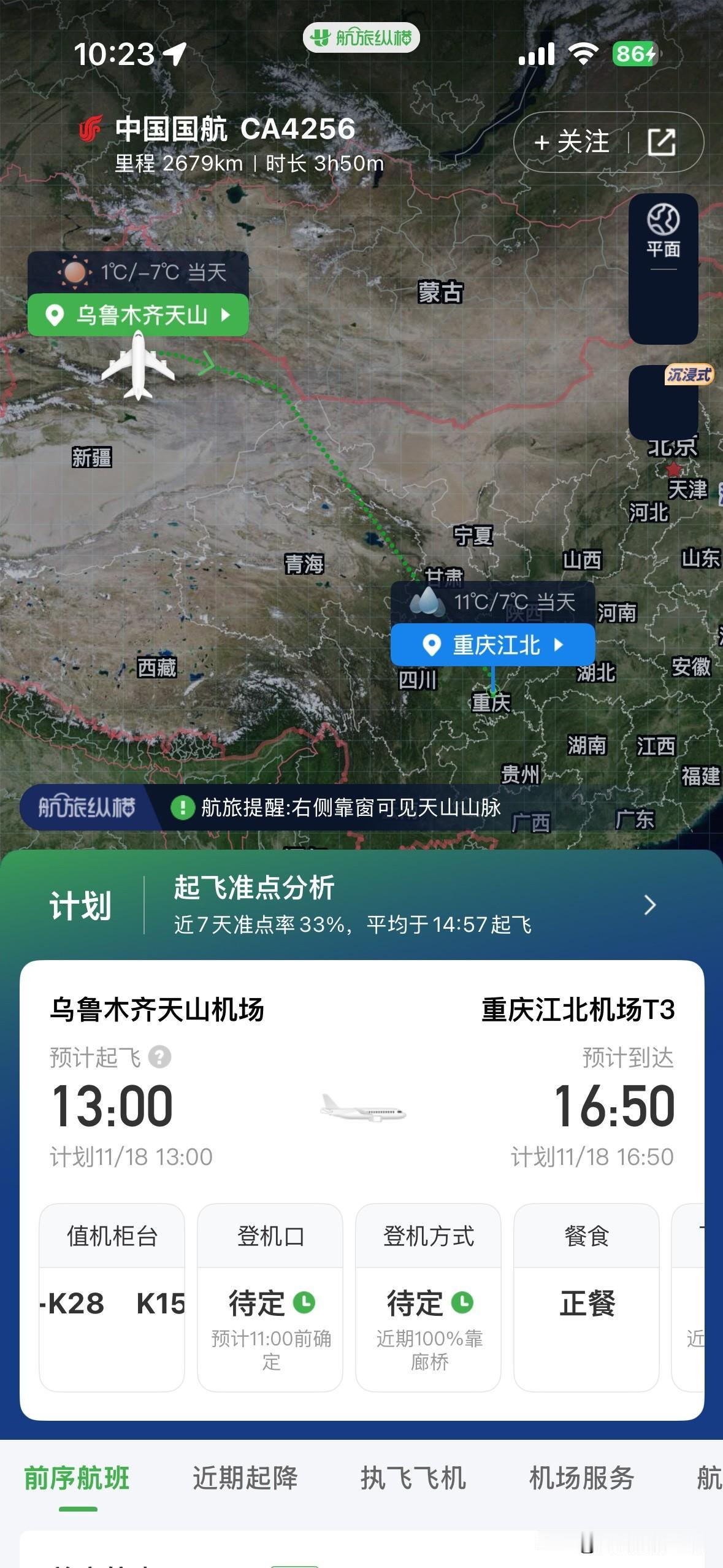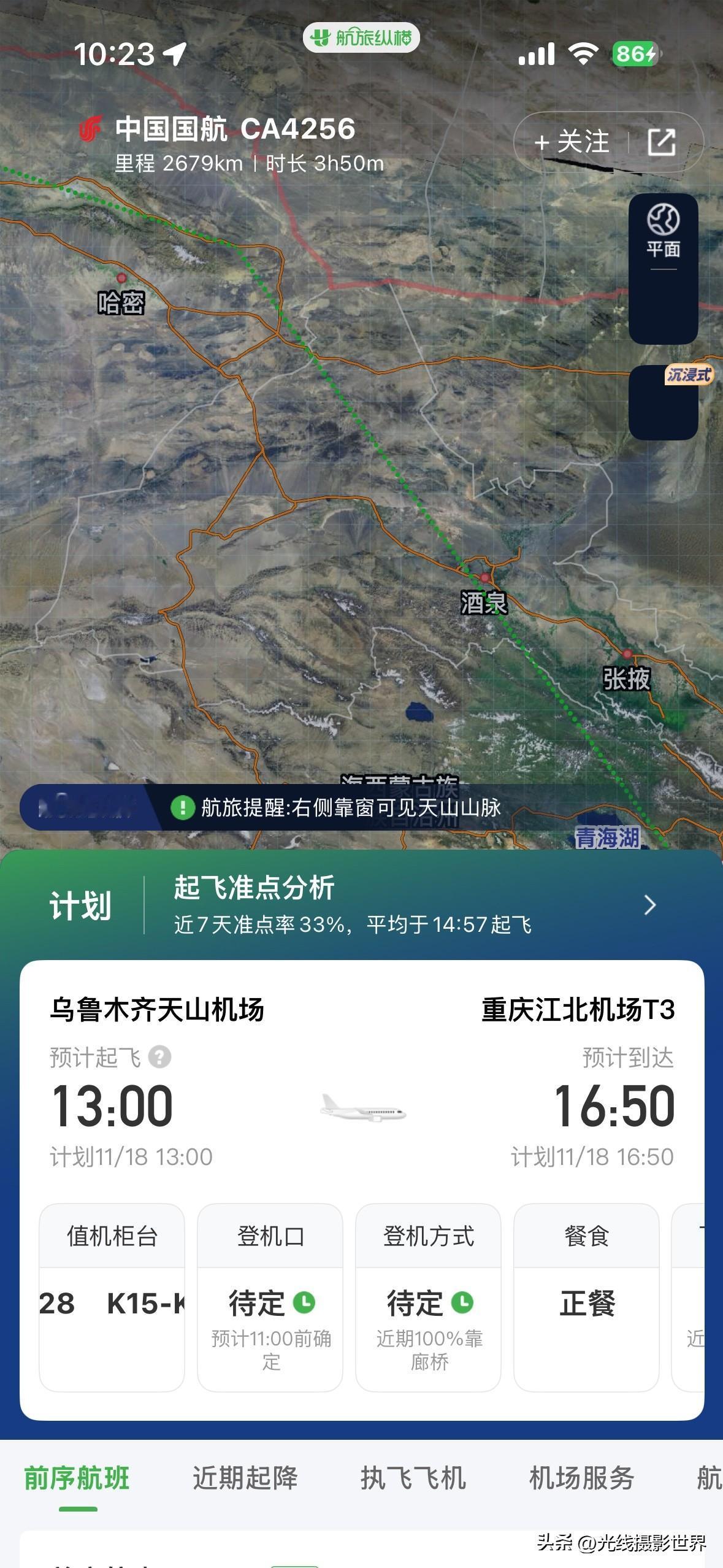 老天爷保佑啊!11月18日下午,重庆主城区,一定要出太阳啊!因为,11月18日下午1点,我将会乘坐中国国航的CA4256次航班从新疆乌鲁木齐天山机场起飞……下午4点50分抵达重庆江北国际机场……我想看看四川盆地的风景啊! 哎!今天,11月14日下午,重庆,成都,四川盆地……细雨蒙蒙,雾气蒙蒙……能见度不行啊! 好吧,老天爷啊,保佑我可以申请到这趟航班的右边的靠窗位置,我想看看天山雪山啊! 老天爷啊!求求你啦! 嗯,11月16日一大早就可以开放值机和选座位啦!老天爷啊,一定要帮帮我啊!