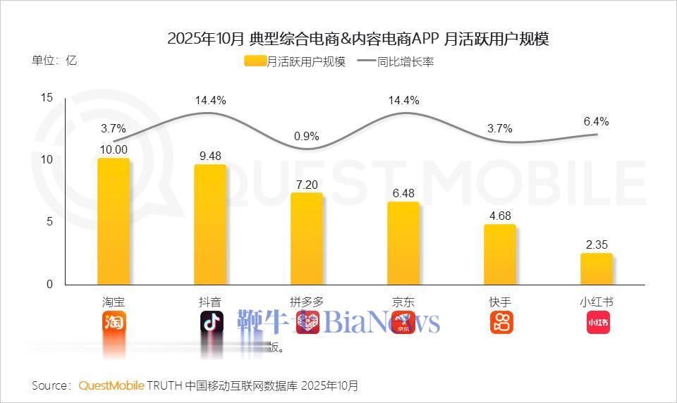 QuestMobile数据显示,2025年10月,淘宝、抖音、拼多多、京东、快手和小红书APP月活跃用户规模同比增速分别为3.7%、14.4%、0.9%、14.4%、3.7%、6.4%,规模分别达到10.00亿、9.48亿、7.20亿、6.48亿、4.68亿、2.35亿。