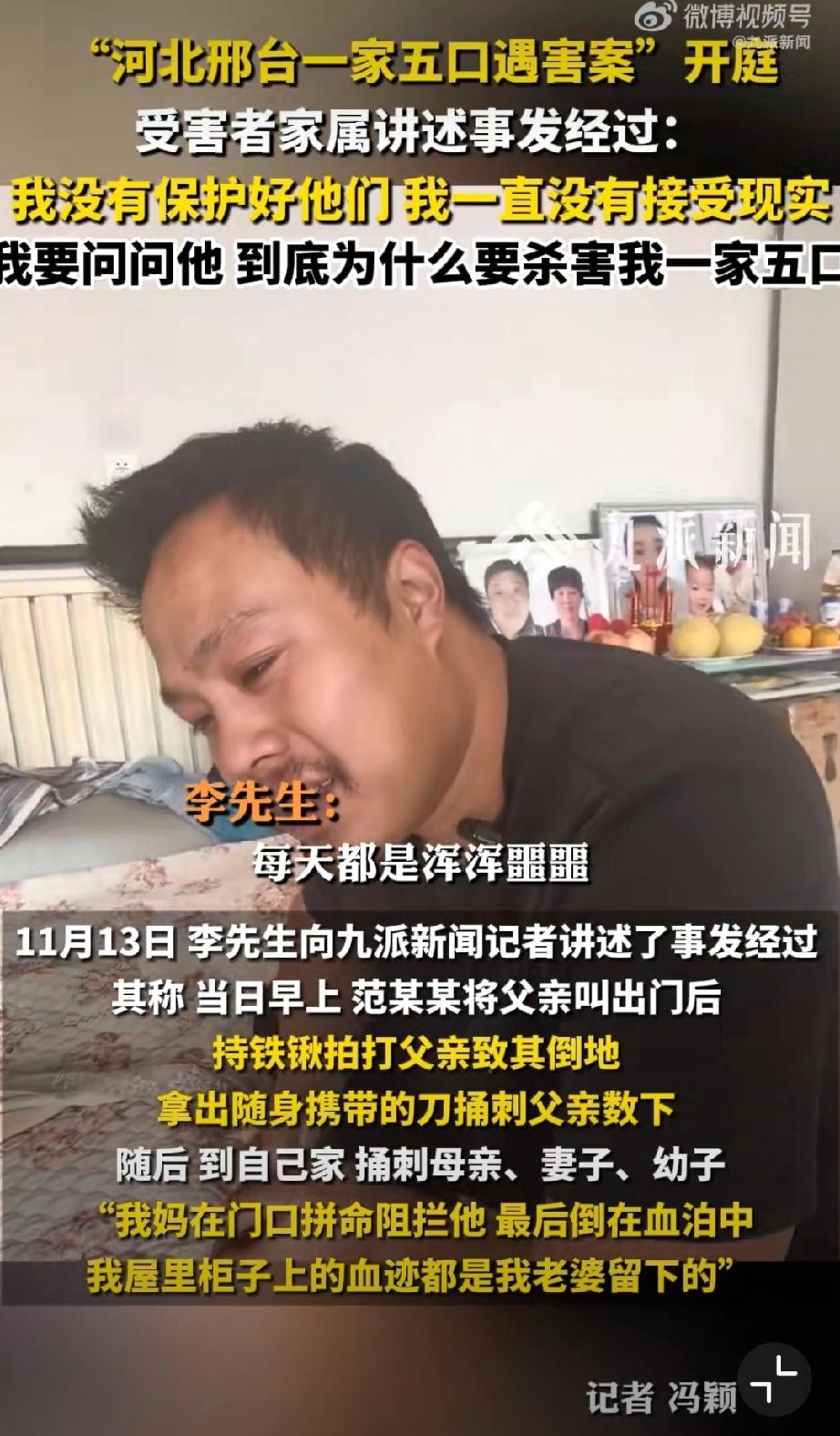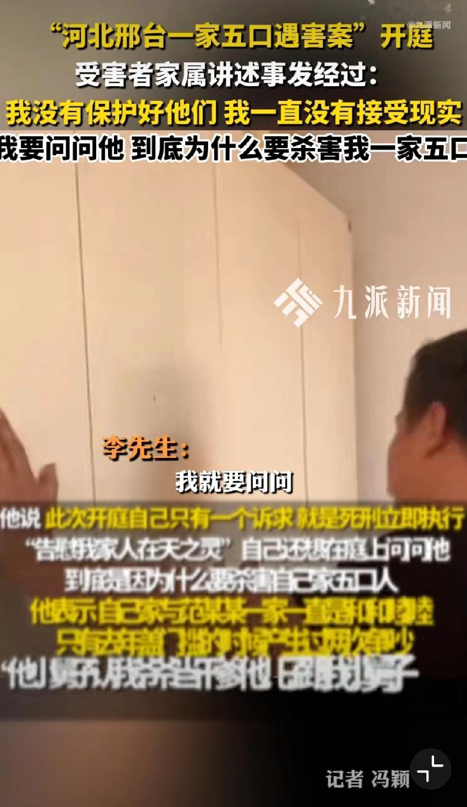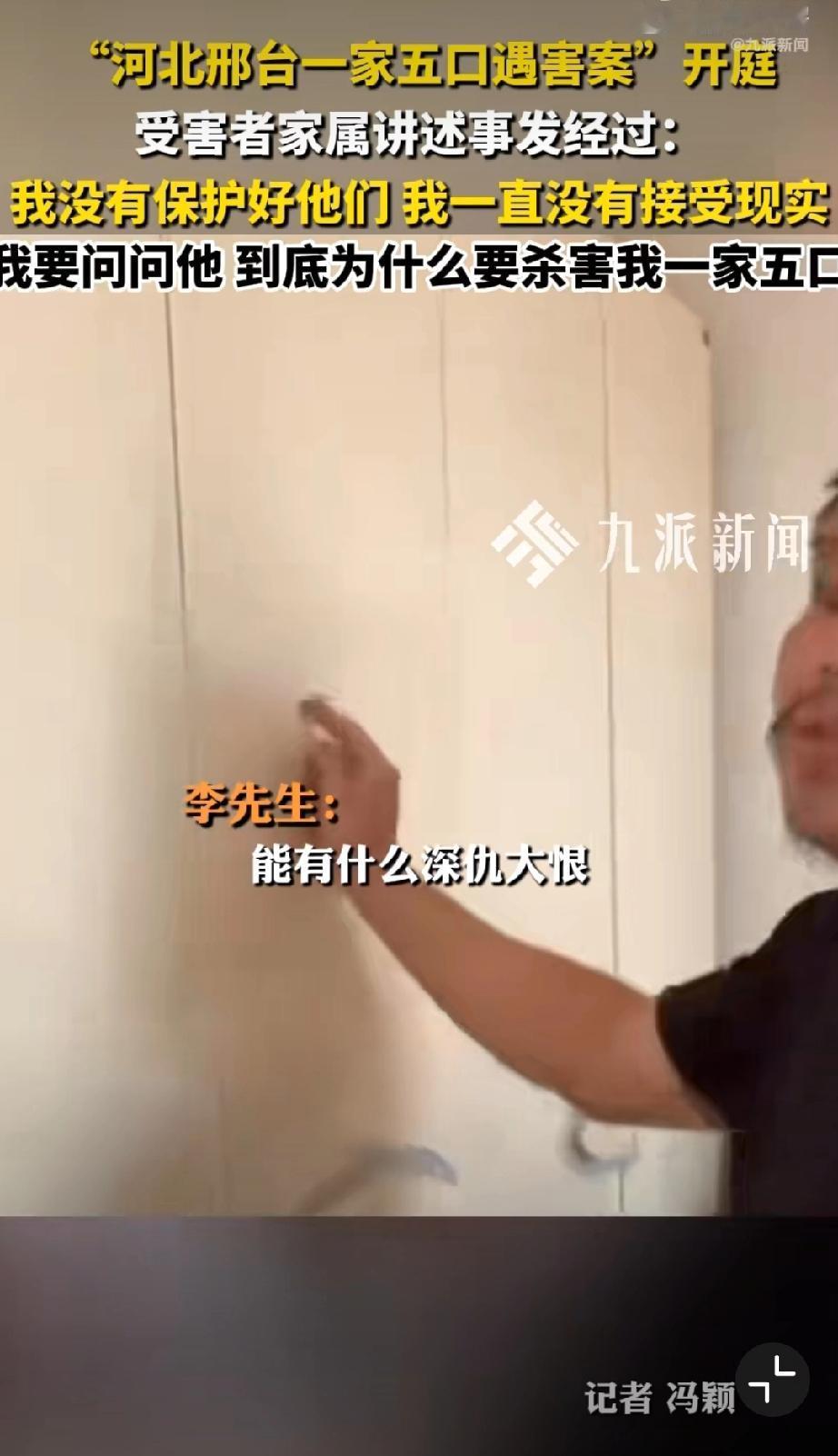 河北邢台一家五口遇害案今天上午开庭,幸存者说是其亲手将五位亲人送进火化炉,唯一诉求就是判死立执!记者问若判决如你所愿你会做什么?李先生回答:完成家人心愿和自己的使命。祖孙三人被害案 五口被害 祖孙三人均遇害