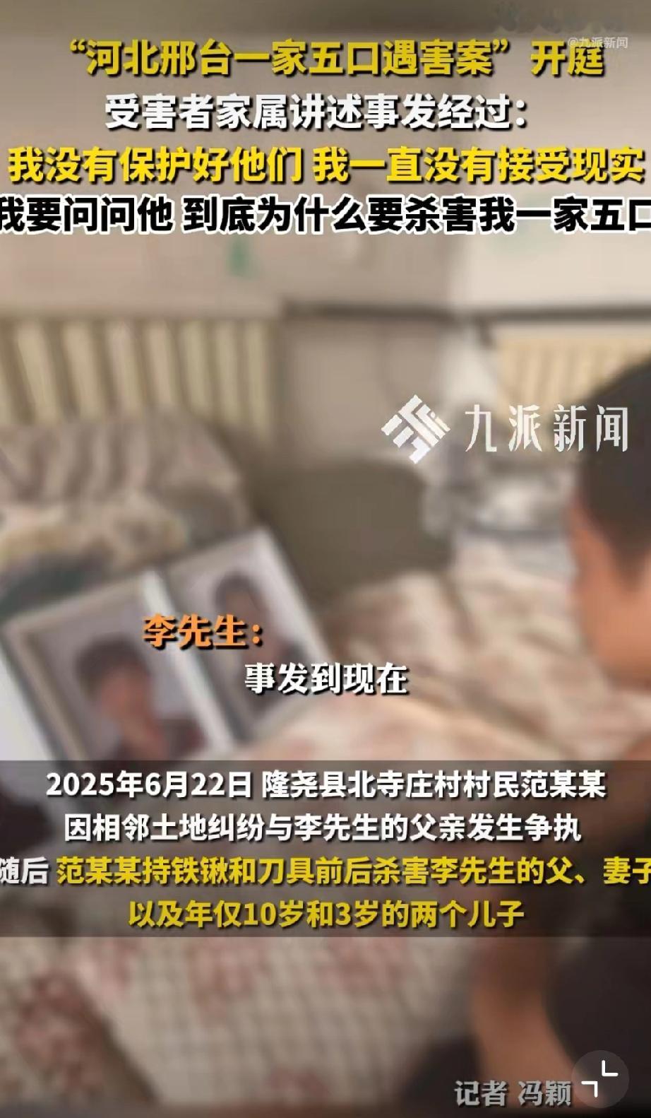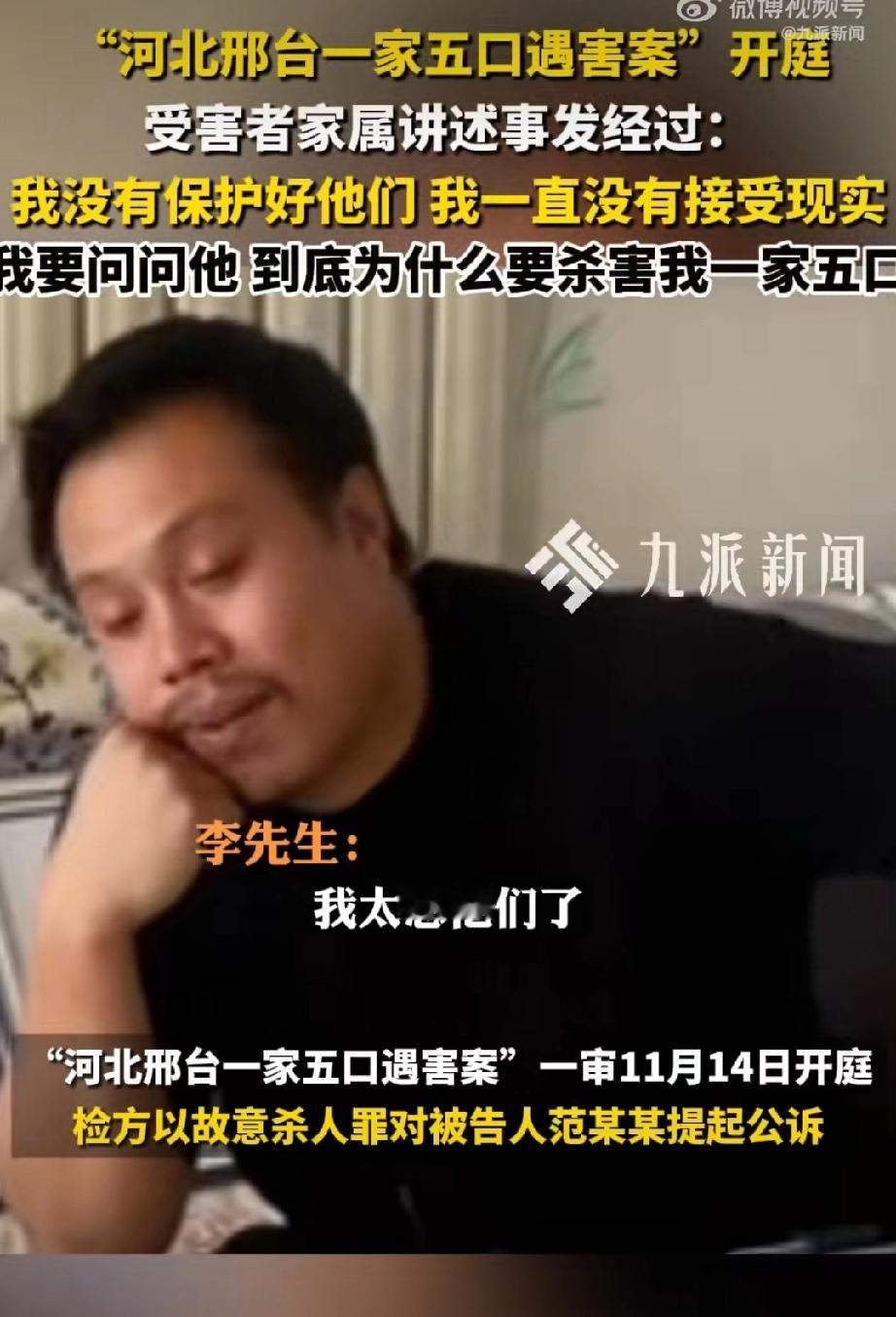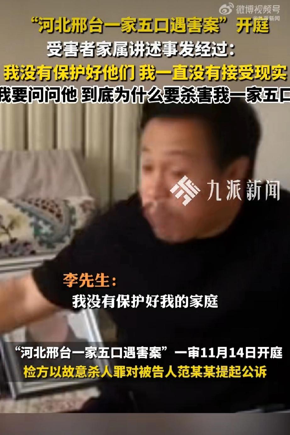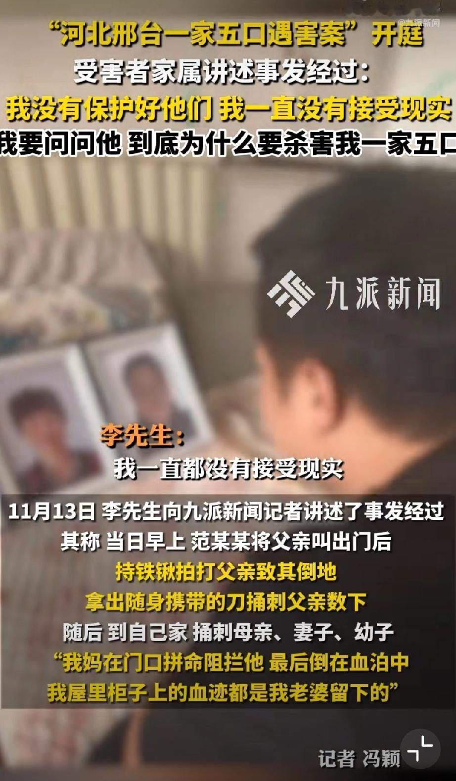 河北邢台一家五口遇害案今天上午开庭,幸存者说是其亲手将五位亲人送进火化炉,唯一诉求就是判死立执!记者问若判决如你所愿你会做什么?李先生回答:完成家人心愿和自己的使命。祖孙三人被害案 五口被害 祖孙三人均遇害