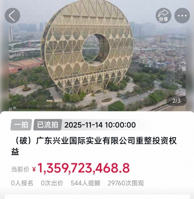 大皖新闻记者在评估报告上看到,13日10时到14日10时,广东兴业国际实业有限公司重整投资权益在阿里资产平台拍卖。拍卖原因系破产重整,评估价近17亿元,起拍价打了8折,以13.6亿元起拍。不过,截至11月14日10时,因为无人报名竞拍,最终流拍。此次拍卖吸引了近3万人次围观。