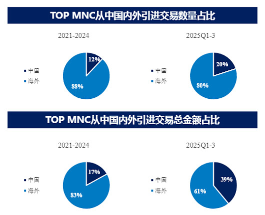 据机构统计,2025年上半年,超过七成Biotech企业实现营收正增长,约66%的企业营收规模突破1亿元,近15%的企业营收超10亿元。我国BioPharma正从单一研发向全产业链整合转型,逐步成长为全球生物医药领域的重要力量。值得一提的是,2025年中国创新药出海呈现爆发式增长态势,2025Q1~Q3license-out交易共103笔超2024年全年数量,交易总金额达920.3亿美元,同比增长77%;TOPMNC从中国BD交易数量占全球总数量20%、总金额占比达到39%。