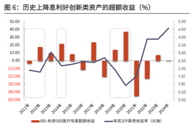 光大证券指出,美联储已开启降息通道,利好创新类资产。从过往的历史发展来看,在降息通道,医药板块内的创新类资产会随着低利率宽松环境而获得更好的估值溢价。例如,参考10Y美债收益率的走势,在2011~2012、2014、2019~2020这些降息通道的历史区间,代表创新类资产的XBI相较于代表大型企业的标普500医疗获得了更好的超额收益。随着美联储在2025年9月再次降息,宏观环境有望重回降息通道,利好医药生物行业中创新药、创新器械等创新类资产。