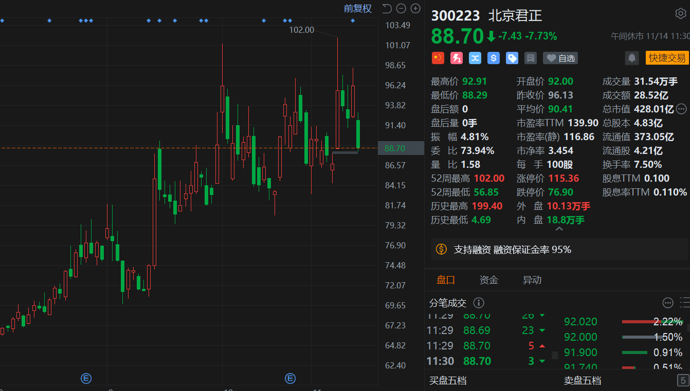 格隆汇11月14日|北京君正(300223.SZ)午间大幅收跌7.73%,报88.7元,总市值428亿元。消息上,北京君正昨日晚间公告,公司股东北京四海君芯有限公司、控股股东暨实际控制人之一/董事李杰、董事冼永辉、董事张燕祥及高级管理人员张敏于2025年9月17日至2025年11月11日期间以集中竞价方式合计减持162.266万股,占总股本比例0.3363%,减持计划已实施完毕。