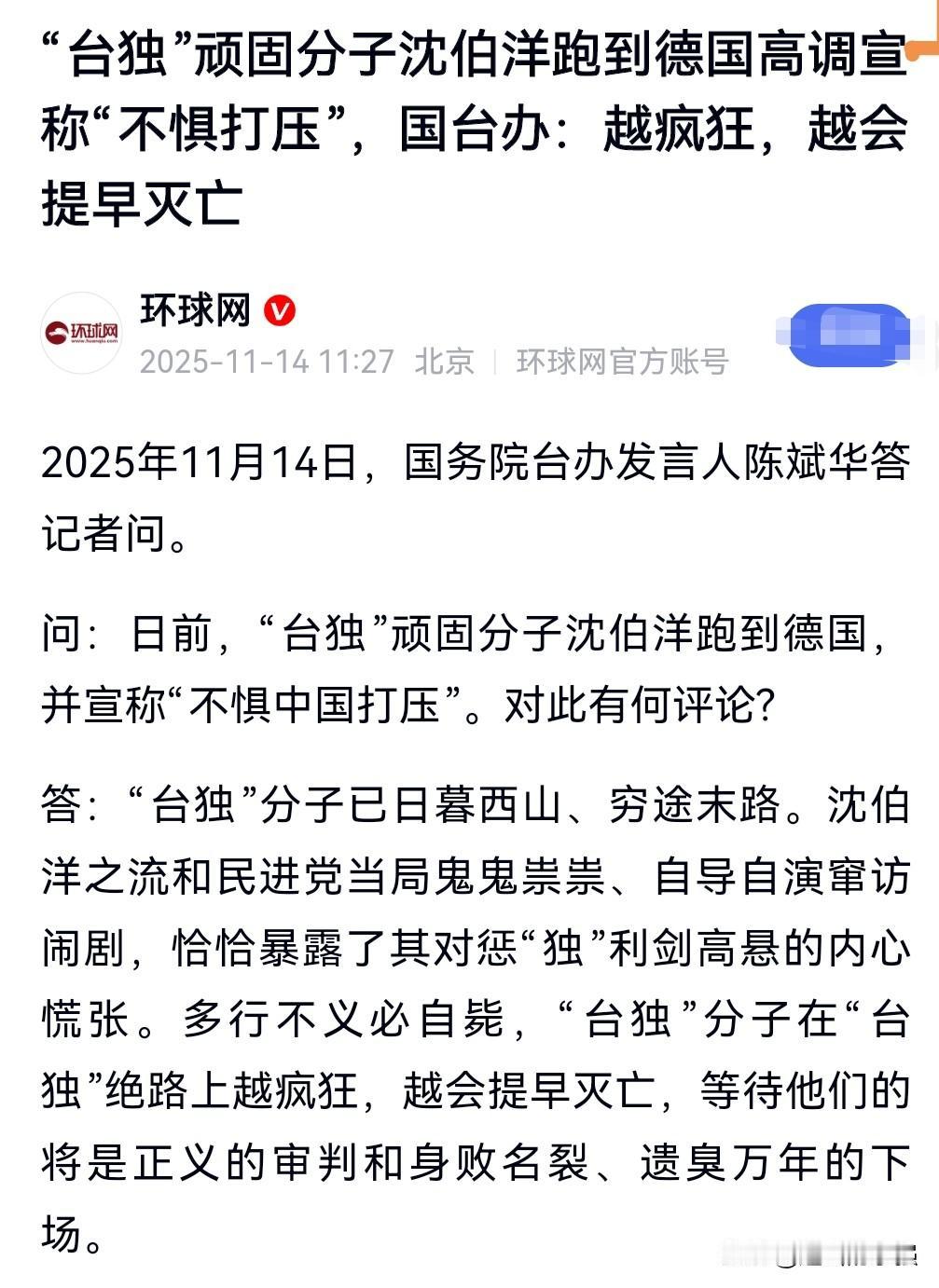 台独顽固分子沈伯洋就是个嘴强王者。 日前沈伯洋跑到德国说不怕中国的打压。 我想他心里肯定慌的不得了,只不过是嘴硬而已。 他骗得了别人,骗不了自己,想必他的内心已经惶恐不安了。 国台办回应“台独”沈伯洋跑到德国,称台独顽固分子必将遗臭万年。