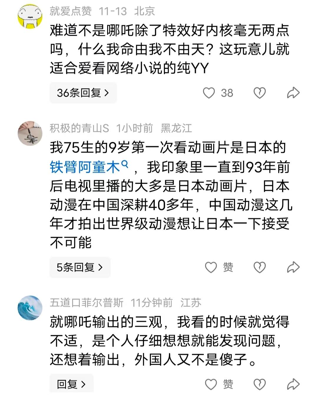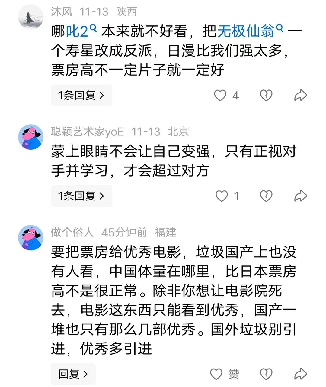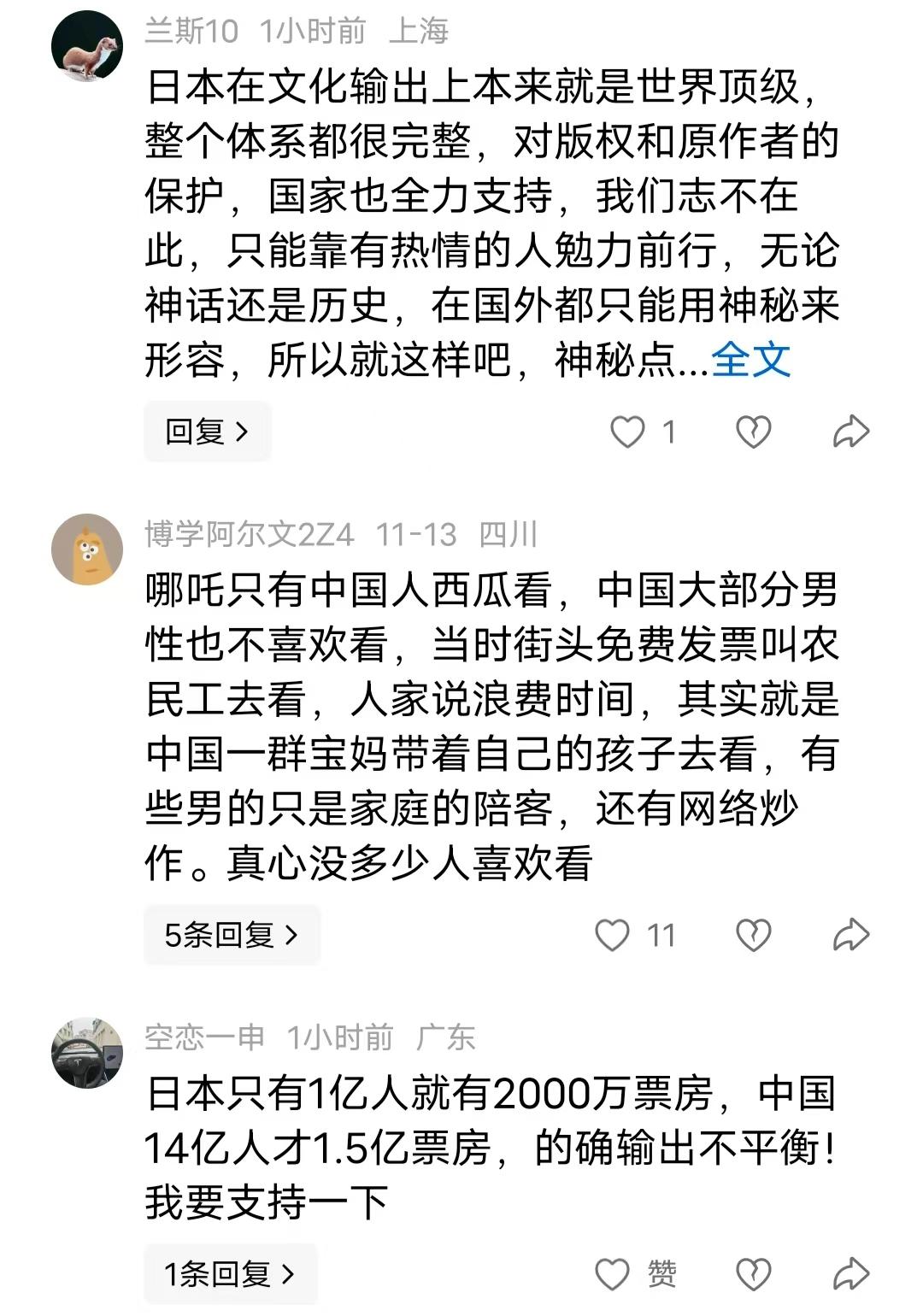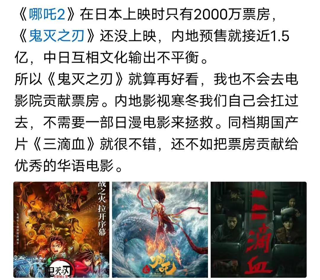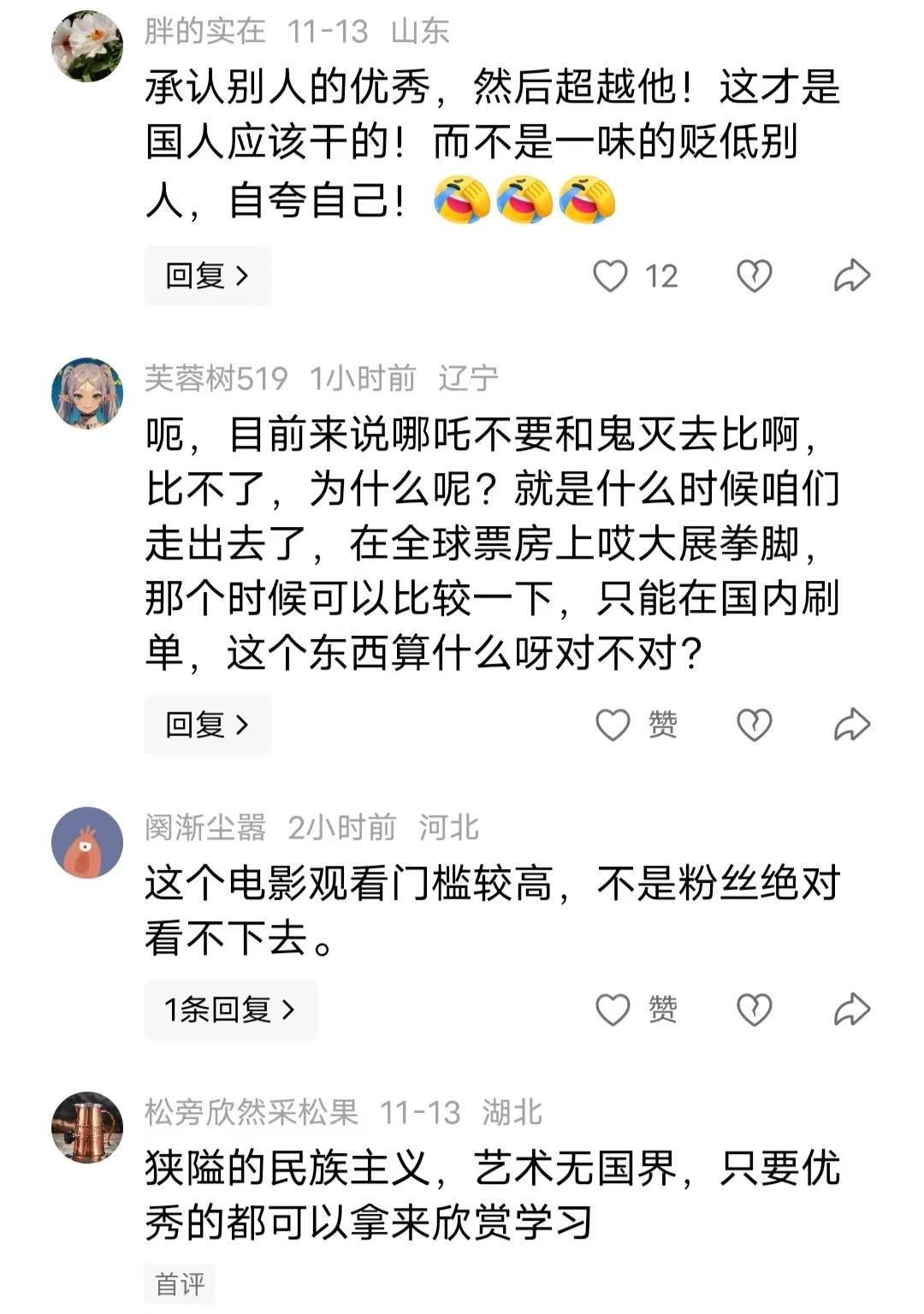 《鬼灭之刃》上映后,《哪吒2》的风评突然变差了。看到有博主发了一篇关于两部电影票房比较的博文,评论区一边倒支持《鬼灭之刃》,都说日漫才是我们学习的方向。 截止目前,《鬼灭之刃》才上映半天时间,内地票房就突破一亿,全球取得的票房成绩也相当不错,难道《哪吒2》真被我们自己捧太高了?