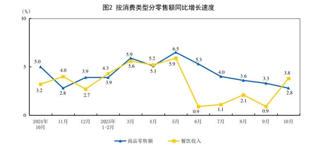 按消费类型分,10月份,商品零售额41092亿元,同比增长2.8%;餐饮收入5199亿元,增长3.8%。1—10月份,商品零售额365981亿元,增长4.4%;餐饮收入46188亿元,增长3.3%。