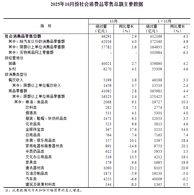 10月份,社会消费品零售总额46291亿元,同比增长2.9%。其中,除汽车以外的消费品零售额42036亿元,增长4.0%。1—10月份,社会消费品零售总额412169亿元,增长4.3%。其中,除汽车以外的消费品零售额372160亿元,增长4.9%。