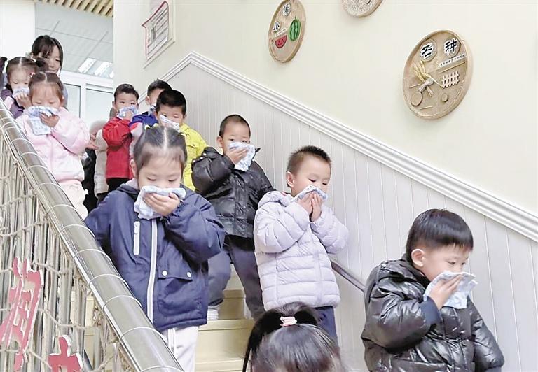 随着警报声响起,各班老师有序组织幼儿快速疏散,全体幼儿捂住口鼻、低头弯腰,不惊慌、听指挥、动作敏捷地撤离到安全地带。