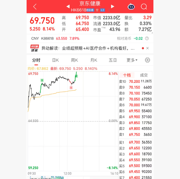 上证报中国证券网讯(记者李五强)11月14日,京东健康高开高走。截至13时33分,该股涨8.14%,报69.75港元/股,成交额7.27亿港元,市值达2233亿港元。