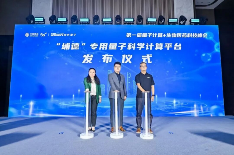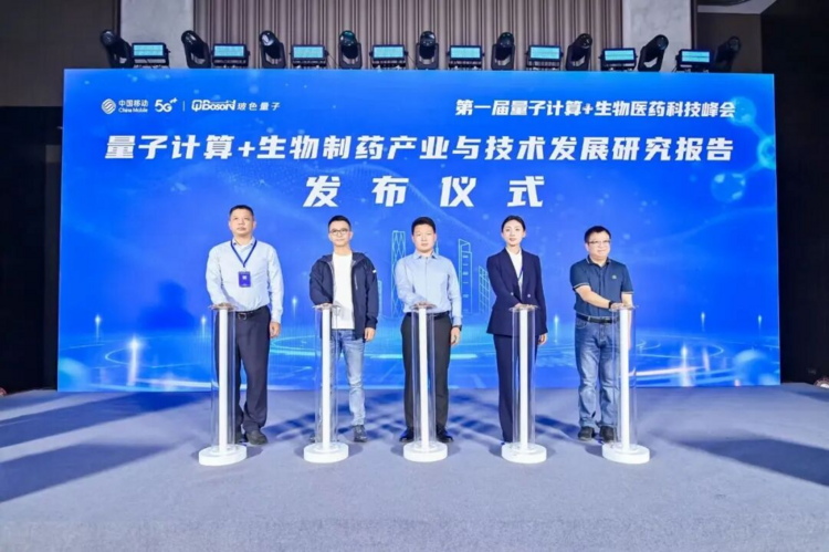 量子科技长三角产业创新中心产业发展部王维主任、粤港澳大湾区量子科技与产业创新联盟代表、中山大学药学院胡文浩院长、玻色量子算法总监高奇、中国移动集团首席专家、云能力中心副总工程师钱岭共同上台启动发布。