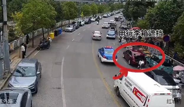 该车驾驶员在路边违停后,拿了一张旁边的塑料凳试图遮挡车辆后车牌,发现凳子不能完全遮挡号牌后,她又打开后备箱,从后备箱内取出一个行李箱,见行李箱可以完全遮挡后车牌,她就到旁边的小吃摊坐下吃早餐。该车驾驶人未曾想到其故意遮挡机动车号牌的交通违法行为已被路面监控完整收录。