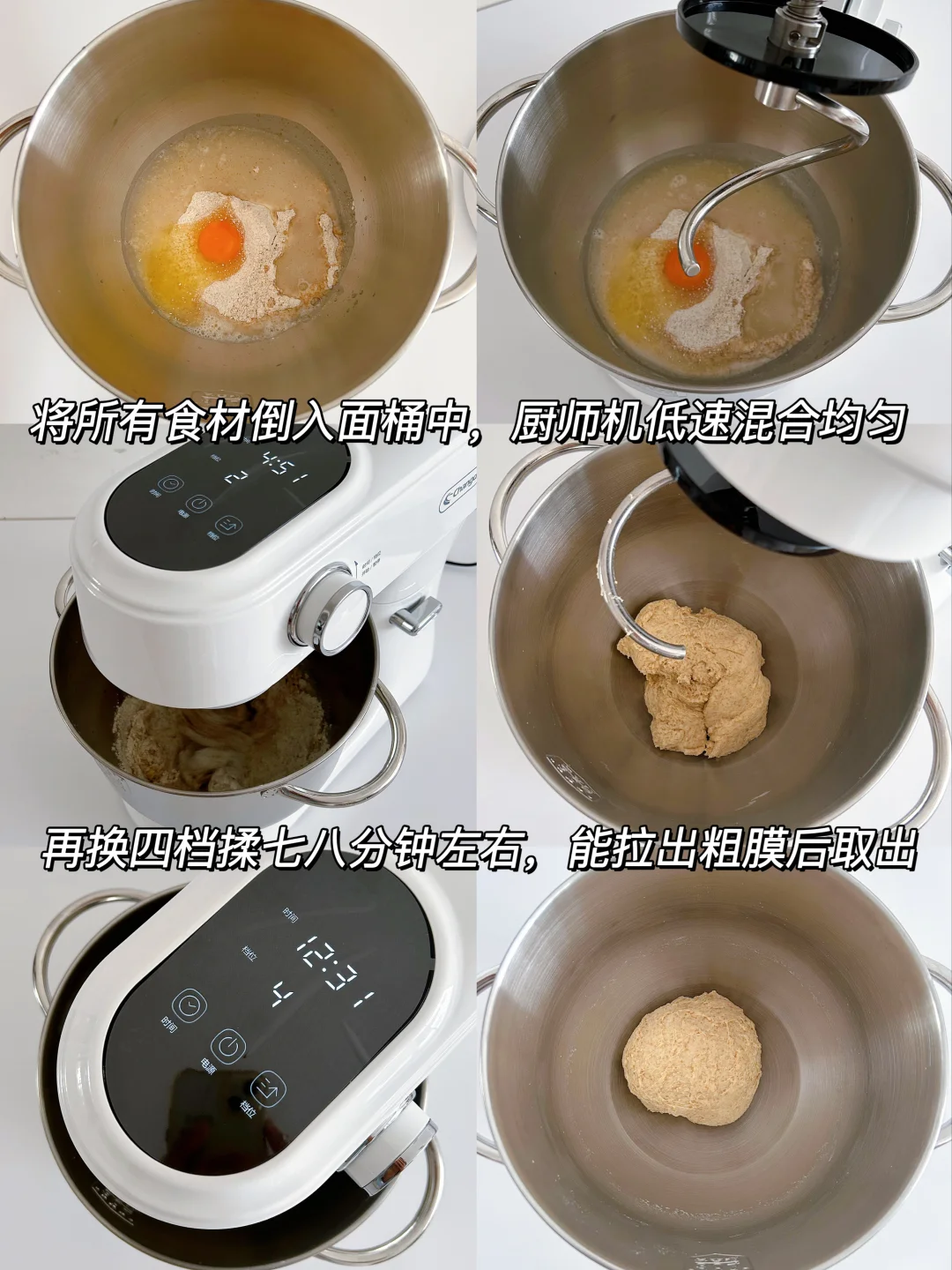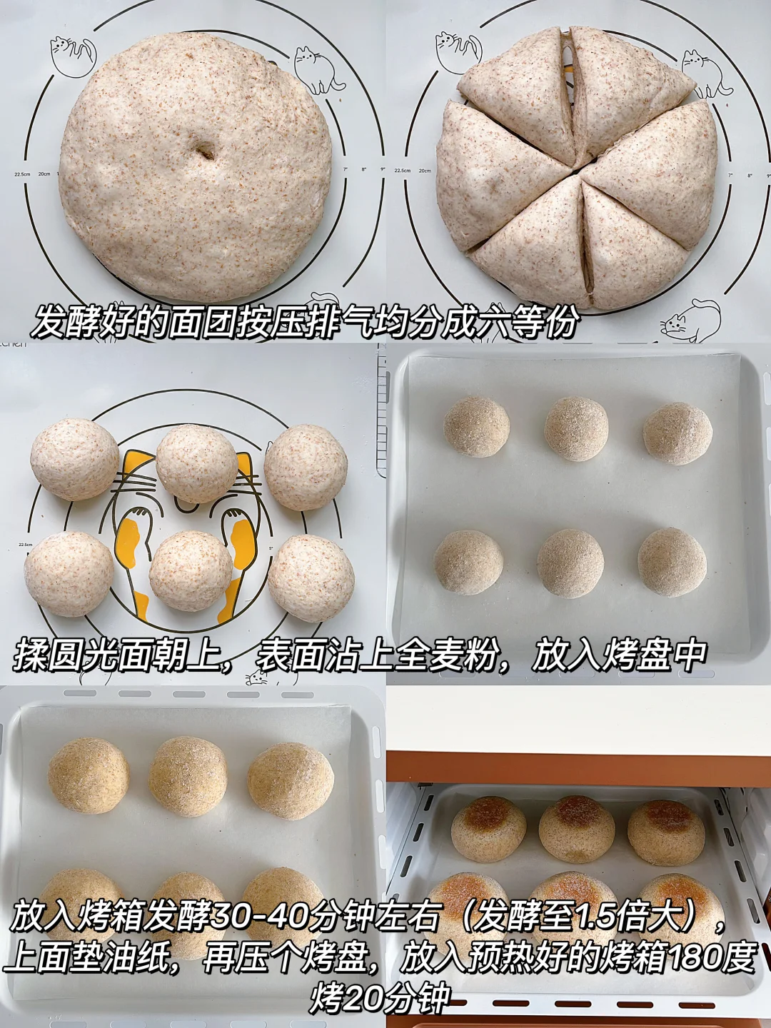 在家自制无油无糖的全麦面包,麦香味浓郁,香软又有嚼劲,做法巨简单,无需手套膜一次成功! 👉食材: 高筋面粉150g、全麦面粉100g、奶粉10g、酵母3g、食用盐3g、鸡蛋1个、水125g ✅做法: 1⃣、将所有食材倒入揉面桶里中,厨师机低速揉3分钟后换高速揉七八分钟,能拉出粗膜即可,将面团收圆放入容器中,盖保鲜膜室温发酵至两倍大; 2⃣、发酵好的面团取出排气,切割成六等份滚圆,表面再滚上一层全麦粉,放入垫好油纸的烤盘中; 3⃣、放入烤箱二次发酵,发酵30-40分钟左右(发酵至1.5倍大,体积变大变轻) 4⃣、面包表面铺上一层油纸,再压上一个烤盘,送入预热好的烤箱中层上下火180度烤20分钟左右。 放凉后密封冷冻保存。