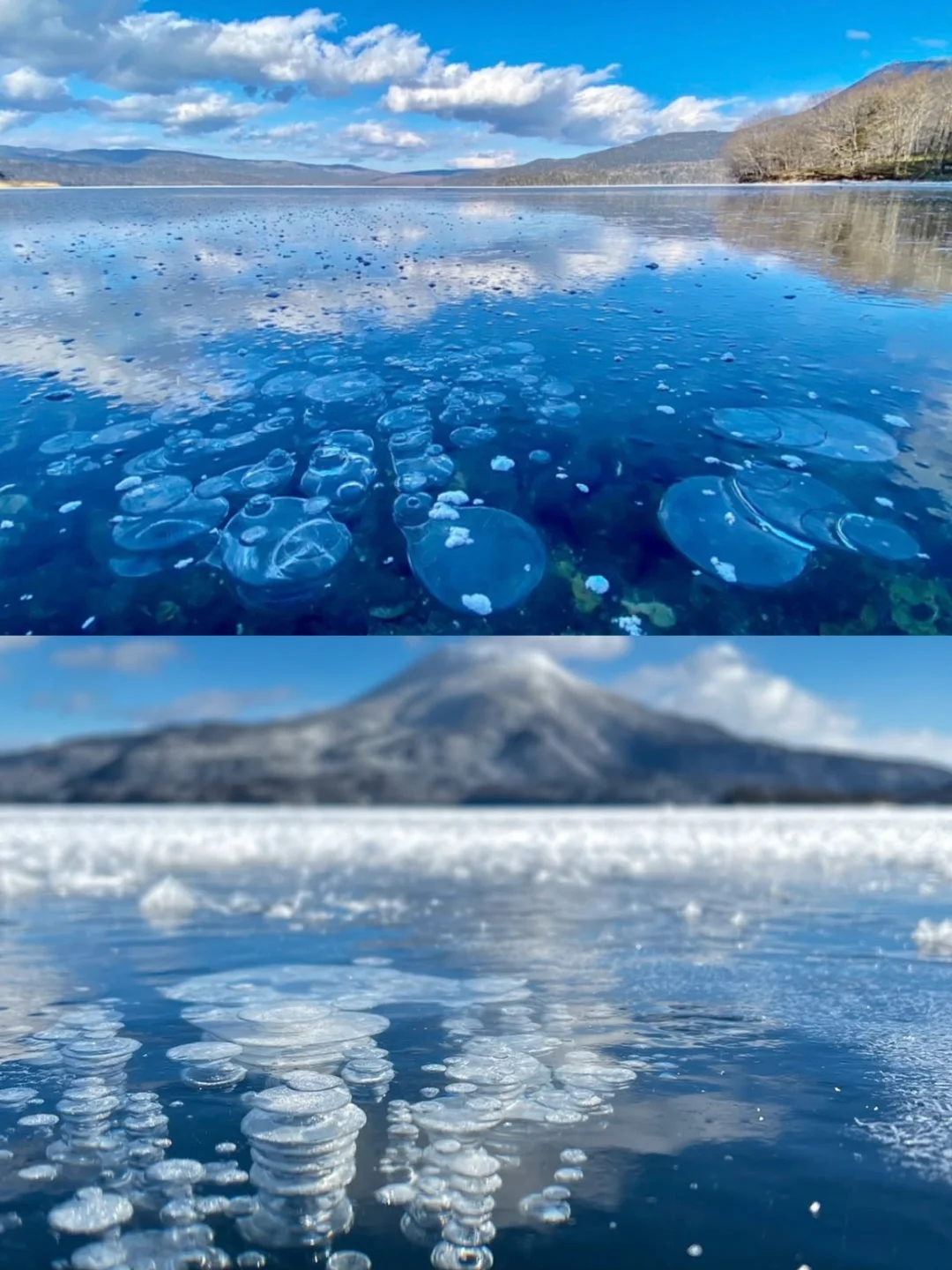 当风停、雪薄、气温足够低时,冰下的气泡被层层封住,