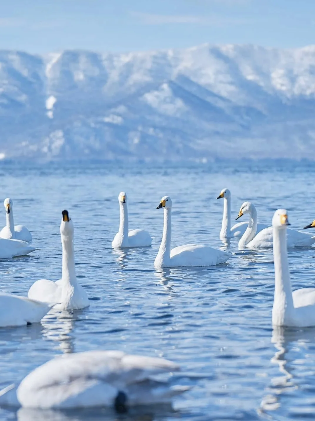 一群白天鹅在水面上游,