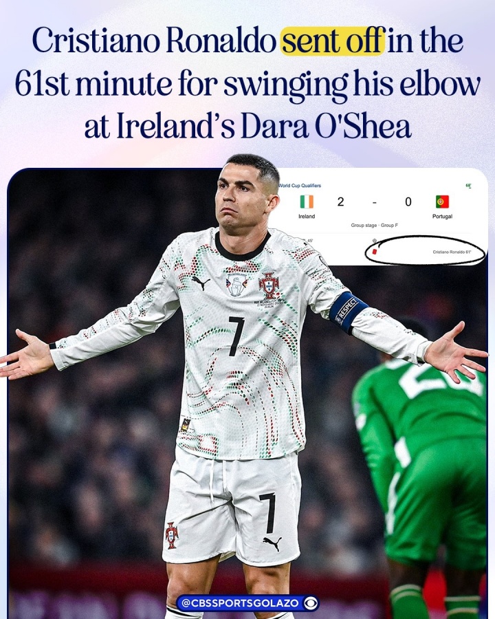 C罗因暴力行为被VAR审查后罚下,他将错过葡萄牙在2026世界杯的首场比赛。