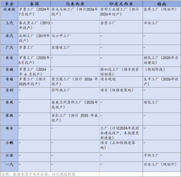 时代周报不完全统计,中国主流整车厂商在泰国、马来西亚、印度尼西亚、越南等不同国家均有工厂落地,且各国家工厂覆盖已投产、预计投产、规划建设等不同阶段,形成了多维度、广覆盖的跨国建厂格局。