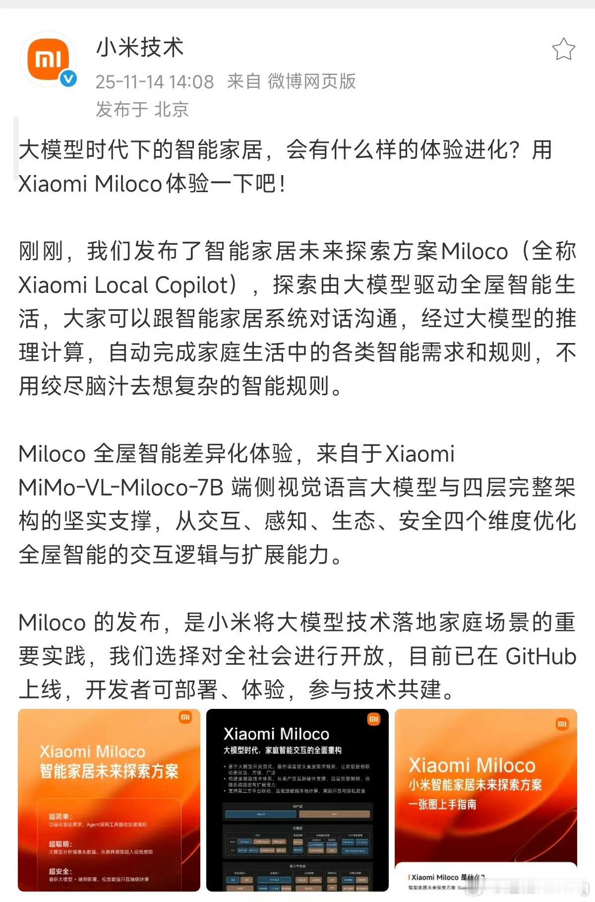 看到github上的Xiaomi Miloco的时候,我还以为是开源了模型和算法,刚刚看了下小米技术发的动态,原来已经可以直接部署了吗这确实有点牛了,直接把智能家居的竞争带到了下一个时代。有一说一,目前智能家居领域能赶上小米去掉ai部分的都没有,现在加上ai,小米直接干出代差了