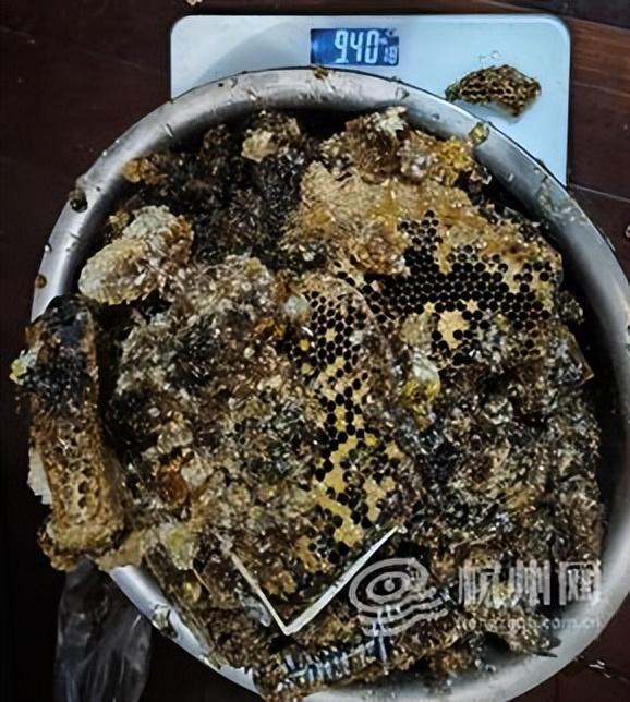 为避免蜂群攻击,消防员穿戴好全套防蜂服,先用专业工具清理周边障碍物,为作业腾出空间。由于橱柜底部操作空间极度狭小,消防员只能半蹲在地,小心翼翼地用工具将黏性极强、质地湿重的蜂巢一块块剥离。整个清理过程耗时耗力,经过近2小时的紧张作业,这个巨型蜂巢被完整移除,一过秤重量竟达近10千克。