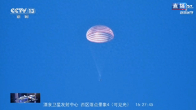 载着神舟二十号航天员乘组的神舟二十一号载人飞船返回舱在东风着陆场成功着陆。