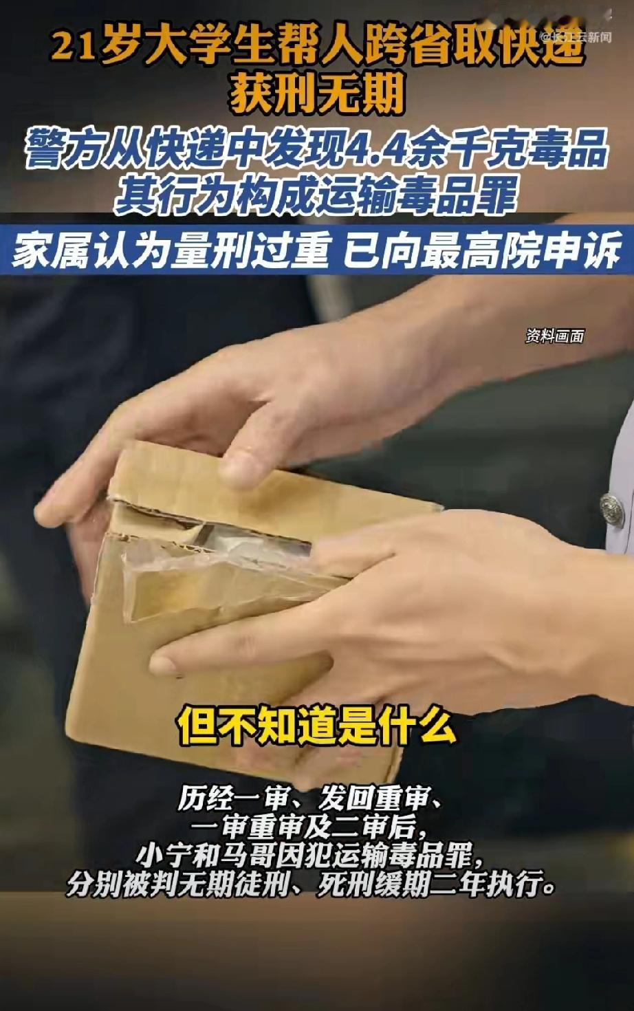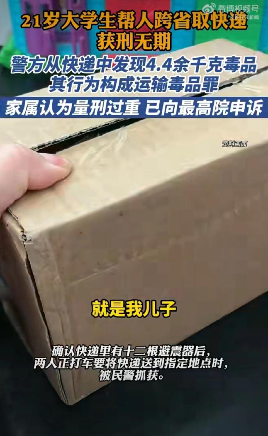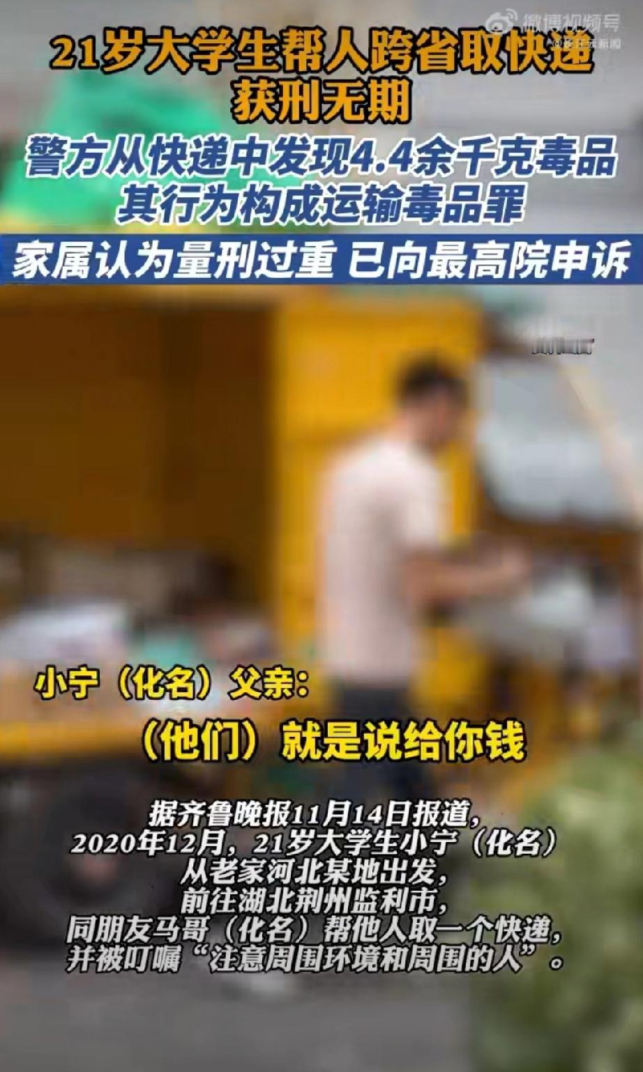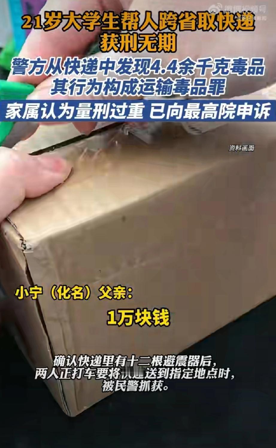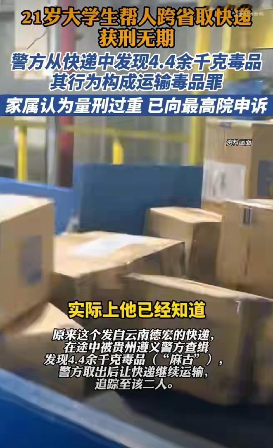 21岁大学生帮人跨省取快递获刑无期! 21岁,大学生,取快递,被判无期都提了,标题就不提取个快递1万和4.4千克毒品。取个快递给你1万,这事违不违法你心里没数吗?活该![再见] 诈骗快递 快递伤人 未成年人寄快递