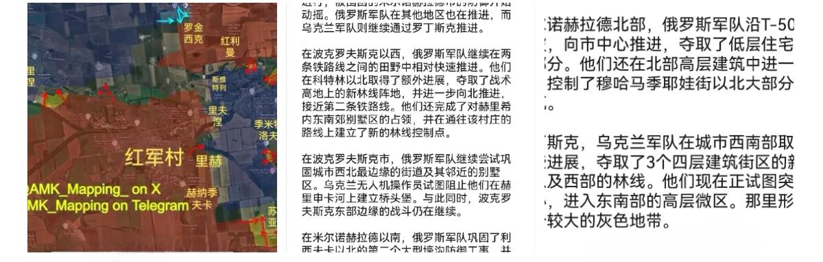 俄东部军区第36集团军第5坦克旅部队通过越过反坦克障碍物(壕沟、四面体障碍)、雷区、加固火力点和扬丘尔河等屏障,完全攻占了第聂伯罗彼得罗夫斯克州的丹尼洛夫卡镇。在争夺该村庄的战斗中,乌军第154机械化旅不仅损失了约一个排的兵力,还损失了大量装备——超过12辆(自行火炮、坦克、装甲车)。 11月13日新西兰信源“AMK_Mapping”报告了红军村(波克罗夫斯克)方向的最新战况。 赫尔松方向,俄军第61海军步兵旅使用FPV无人机击毁一艘载有突击队的乌军快艇,而后补刀摧毁了漂到岸边的快艇残骸,看起来剩余地区染料还不少。 视频显示近五十辆乌军装甲车在红军村-季米特洛夫-罗金西克市三角地带的补给主干道区域被俄罗斯中央军区和俄军“卢比孔”无人机部队的FPV无人机击毁。 00:02 - 🇺🇸 International MaxxPro装甲车 00:06 - 🇹🇷 “基尔皮”(Kirpi)装甲车 00:19 - 🇨🇦 “参议员”(Senator)装甲车 00:26 - 🇨🇦 “参议员”装甲车 00:29 - 🇵🇱 Oncilla装甲车 00:31 - 🇺🇦 “创新者”装甲车 00:35 - 🇺🇸 “悍马”(HMMWV)装甲车 00:39 - 🇸🇪 BVS-10全地形装甲车 00:41 - 🇹🇷 “基尔皮”装甲车 00:48 - 🇺🇦 “创新者-2”装甲车 00:54 - 🇨🇦 “参议员”装甲车 01:01 - 🇺🇦 “创新者-2”装甲车 01:04 - 🇺🇦 “创新者-2”装甲车 01:07 - 🇺🇦 UAT Gyurza 01装甲车 01:09 - 🇺🇦 “科扎克-2М1”装甲车 01:11 - 🇺🇦 “创新者-2”装甲车 01:13 - 🇨🇦 “参议员”装甲车 01:14 - 🇺🇦 “科扎克-5”装甲车 01:16 - 🇺🇸 M1126“史崔克”装甲运兵车 01:17 - 🇺🇦 BTR-4E装甲运兵车 01:19 - 🇹🇷 “基尔皮”装甲车 01:21 - 🇺🇸 International MaxxPro装甲车 01:22 - 🇺🇦 UAT Gyurza 01装甲车 01:24 - 🇸🇪 BVS-10全地形装甲车 01:25 - 🇺🇸 International MaxxPro装甲车 01:26 - 🇺🇸 M113装甲运兵车 01:28 - 🇹🇷 “基尔皮”装甲车 01:35 - 🇺🇸 M1126“史崔克”装甲运兵车 01:40 - 🇺🇸 M113装甲运兵车 01:42 - 🇺🇸 M113装甲运兵车 01:44 - 🇬🇧 Land Rover Snatch轻型装甲车 02:09 - 🇺🇸 M577GA2装甲指挥车 02:34 - 🇺🇦 “创新者-2”装甲车 02:39 - 🇺🇦 UAT Gyurza 01装甲车 02:52 - 🇺🇦 “创新者”装甲车 02:55 - 🇨🇦 “参议员”装甲车 02:56 - 🇺🇦 “创新者-2”装甲车 03:02 - 🇺🇦 “创新者-2”装甲车 03:04 - 🇺🇸 “悍马”装甲车 03:07 - 🇺🇦 UAT-TISA装甲车 03:44 - 🇨🇦 “参议员”装甲车 03:52 - 🇺🇸 M113装甲运兵车 04:05 - 🇺🇦 “创新者-2”装甲车 04:13 - 🇺🇸 “悍马”装甲车 04:31 - 🇺🇸 “悍马”装甲车 俄军进入红军村西北部的格里希诺村。与此同时,并在其西部的E50公路段推进,获得公路机动权。 俄国防部通报:北部军团通过果断行动,解放了哈尔科夫地区的西涅利尼科沃定居点。东部军团继续向敌军防御纵深推进,通过积极作战解放了第聂伯罗彼得罗夫斯克州的达尼洛夫卡定居点。 俄乌拉尔车辆制造厂向俄军交付了新一批TOS-1A“日炙”火箭炮。 今天俄“天竺葵-2”自杀式无人机“访问”了扎波罗热市某个目标、苏梅市的工业区,以及顿涅茨克州斯拉维扬斯克热电厂。 据称在米尔诺格勒俘虏的一个乌军无人机小组,直接原地送走了。 俄军在米尔诺格勒南部的矿井插旗。 夜间乌首都基辅的能源与军事基础设施遭到俄军严重空袭,初步统计有6枚“匕首”高超声速导弹、15枚“伊斯坎德尔-M”弹道导弹、4枚“口径”巡航导弹和超过100架“天竺葵”自杀式无人机。 俄国人在红军村西北郊乌军发起黑鹰送死行动的地点涂鸦:“感谢布达诺夫的礼物,荣耀属于俄罗斯”。 俄空天军昨天在卡累利阿共和国摔了一架苏-30,飞行员死亡。