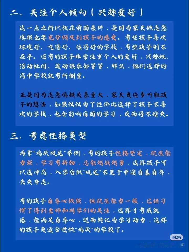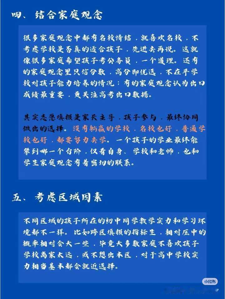 你们是如何给自己的孩子选择高中的呢? 中考选择高中必须考虑的7个关键要素! 家长们!马上中考,现在最头疼的是不是选高中?别只盯着名气和升学率瞎选!我总结了7个超实用选校要素 ,手把手教你挑到最适合的高中! 1️⃣ 成绩定位:别被模考骗了! 模拟考成绩看看就好 ,出题难度和全市排名都不精准。建议重点参考 区排名 + 往届录取分数线,框定3-5所目标校。比如区排名前500,就冲往年录取线略高于自己水平的学校,留1-2所保底校(2025年济南扩招已是定局)! 2️⃣ 文理侧重:提前规划未来赛道 高中选科直接影响大学专业❗️有些学校理科竞赛强,重点班全是物化生大佬;有些学校文科名师扎堆,政史地成绩全市拔尖。提前查学校官网,看看特色班型设置(比如清北班、文科创新班),选对赛道等于赢在起跑线 ‍♀️! 3️⃣ 班型博弈:宁做鸡头还是凤尾? 540-570分的宝子注意啦⚠️!同样分数,私立实验班vs公立普通班怎么选?实验班师资顶配、学习氛围卷,但竞争压力大;普通班更自由,适合自律性强的同学。建议优先选 公立重点班>私立实验班>公立普通班,资源真的差很多! 4️⃣ 艺体生的双刃剑 特长生能降分进好学校 ,但要想清楚:每天训练,文化课容易受影响;高考志愿只能报艺术专业,就业面窄。今年艺考文化课分数线又涨了 ,除非真的热爱+有天赋,否则别轻易尝试! 5️⃣ 管理风格:找到最适配的「家」 严师出高徒VS自由发展?军事化管理的学校作息严格,适合自制力差的同学;开放式管理更注重自主学习,适合自觉娃。偷偷告诉你 :可以找在读学生打听食堂、宿舍、晚自习安排,这些细节最能看出学校真实面貌! 6️⃣ 留好后路:不怕万一就怕后悔 如果跟不上进度怎么办?有些学校支持高二转春考班、艺术班、是否能外出学习?选校时一定要问清楚学校的「补救方案」,给自己留条退路,心里才踏实! 7️⃣ 避坑指南:名气≠适合你 XX中学升学率90%?可能只是重点班撑起来的数据 !再普通的学校,进了重点班+拼命学,照样有机会上好学校; 名校普通班摆烂,也可能连本科线都够不着。记住:努力>学校名气,选对适合自己的才是王道!