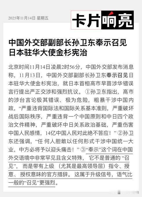 外交部副部长奉示召见日本大使提出严正交涉和强烈抗议! 2025年11月13日,中国外交部副部长孙卫东奉中央领导指示,召见日本驻华大使金杉宪治,就日本首相高市早苗近期在国会答辩中发表的涉台言论提出严正交涉和强烈抗议。这次召见是中方对日方多次交涉后仍未纠正错误言行的回应,措辞严厉,强调台湾问题是中国核心利益的“红线和底线”。 高市早苗作为日本首相,在国会答辩中公然发表露骨挑衅言论,暗示日本可能通过武力介入台海问题。此言论被中方视为“极其错误、极为危险”,粗暴干涉中国内政,严重违反国际法、一个中国原则以及中日四个政治文件精神。 此次事件发生在抗日战争暨世界反法西斯战争胜利80周年、台湾光复80周年之际,中方特别强调历史警示:80年前中国人民浴血奋战打败日本侵略者,今日任何人干涉中国统一大业,将遭“迎头痛击”。 中方此前已通过外交渠道多次提出交涉,但日方“拒不撤回错误言论”,加剧了紧张。外交部发言人林剑在13日例行记者会上重申,如日方胆敢武力介入台海,将构成侵略行为,中方必将坚决回击。
