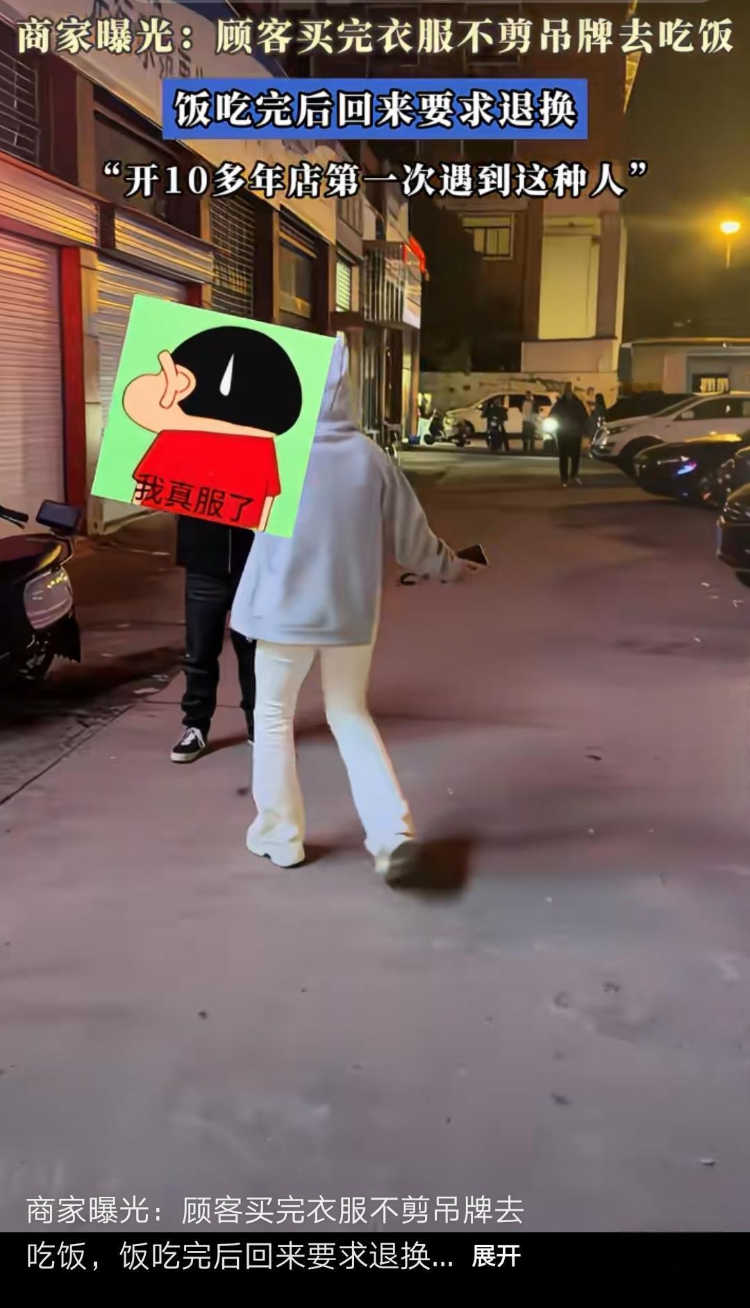 女子买衣服没有剪吊牌,出去吃完火锅后回到店中要求退换,店主不同意退换,更过分的是女子自己拿一件视频里的外衣,穿上就走了, 店主就追上去了,女子也知道丢人,用帽子遮住脸,于是两人在大街上吵闹。 厚颜无耻的人还真不少!干这样的事应该不是头一回,经验丰富啊,只是没想到这个商家不好糊弄! 无理由退货被这些宵小之辈搞的乌烟瘴气,应该曝光这种人的嘴角,隐私权这个时候是起坏作用的。 作为消费者我也厌恶这种白嫖的无耻操作!真是衣服质量问题你可以要求商家退回,别为了满足你那点虚荣心干些令人作呕的事情 做人不能如此不厚道!这个世道怎么这种人越来多,她也敢穿,也敢换,是什么给了她勇气?制定规矩、政策都是为了让人变好的,结果平台这个政策,成了白嫖温床!