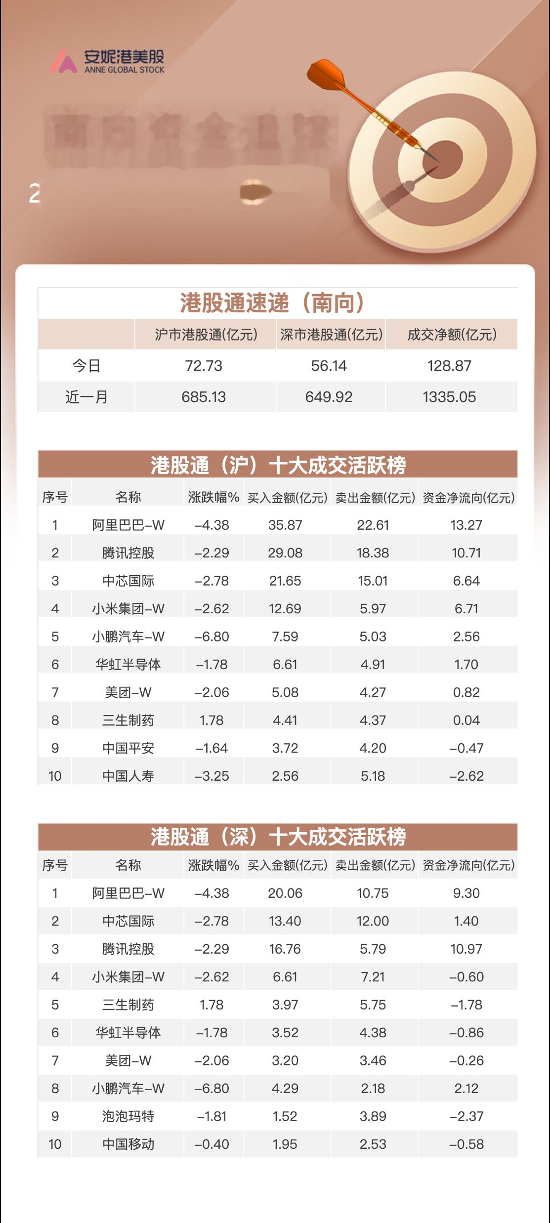 今日,南向资金逆势净买入约128.87亿港元,其中沪港股通净流入约72.73亿港元,深港股通净流入约56.14亿港元。全天成交约966.69亿港元,相当于恒指当日成交额的41.53%。
