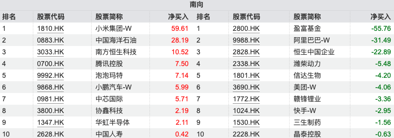 大幅净买入:小米集团-W(01810.HK)59.61亿港元;中国海洋石油(00883.HK)28.19亿港元。