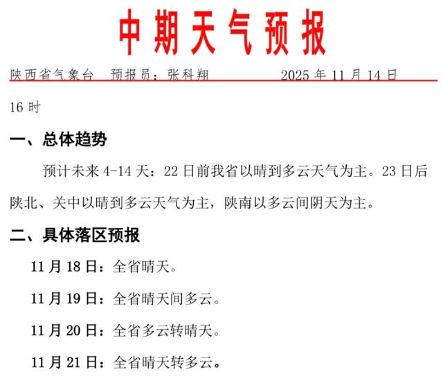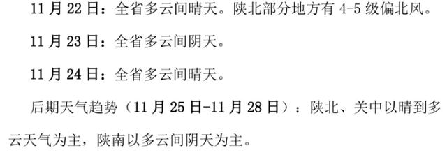 预计未来4-14天:22日前我省以晴到多云天气为主。23日后陕北、关中以晴到多云天气为主,陕南以多云间阴天为主。