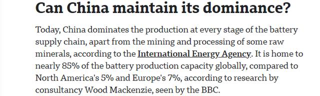据国际能源署称,如今,除部分原材料的开采和加工外,中国在电池供应链的各个环节都占据主导地位。BBC获得的一项研究结果显示,全球近85%的电池产能位于中国,而北美和欧洲分别仅占5%和7%。