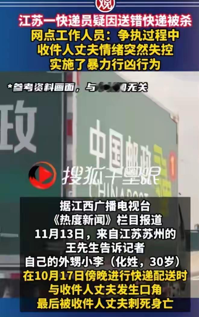 《送错快递赔上性命:30岁快递员被刺身亡,谁该为这场悲剧负责?》 “只是送错了几百米,怎么就丢了命?” 10月17日傍晚,江苏苏州相城区,30岁的快递员小李(化名)在派件时因送错地址,与收件人丈夫发生争执,竟被对方持刀刺死。一场普通的快递纠纷,最终以一条年轻生命的逝去收场。 1. 案件细节:从争执到致命冲突 送错快递:小李误将包裹投递至几百米外的另一小区,收件人丈夫王某发现后情绪激动。 争执升级:双方从口角发展为肢体冲突,王某突然掏刀刺向小李胸部。 抢救无效:小李当场倒地,送医后不治身亡。王某被警方控制,案件正在调查中。 争议点: 王某是否早有预谋携带刀具? 快递公司是否有纠纷处理预案? 2. 社会反思:戾气为何压倒理性? 近年来,类似琐事引发的恶性案件频发: 2023年,广州一外卖员因送餐迟到被顾客殴打致残; 2024年,杭州两名路人因擦碰引发斗殴,1死1伤。 深层原因: 社会压力传导:生活成本高、工作压力大,导致情绪管理能力下降; 纠纷解决机制缺失:平台、物业等中间角色未能及时介入; 违法成本过低:部分人认为“动手大不了赔钱”,法律震慑不足。 3. 如何避免下一个悲剧? ✅ 平台责任: 建立快递员紧急避险流程; 开通用户投诉快速响应通道。 ✅ 法律完善: 对随身携带刀具且引发命案者从重处罚; 推广“非暴力纠纷调解站”进社区。 ✅ 公众教育: 普及冲突化解技巧; 强化“勿以恶小而为之”的法治观念。 小李的死亡不应只是热搜上的一阵叹息。从平台到个人,每个环节都需反思:我们的社会,是否已习惯了用暴力解决最微小的矛盾?杭州外卖员之死 激情杀人 猫狗被遗弃后咬伤人,谁来赔偿
