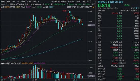 热门ETF方面,重仓光模块等算力方向的创业板人工智能ETF(159363)场内收跌3.42%失守60日线,单日缩量成交4.3亿元,资金逢跌净申购4400万份。