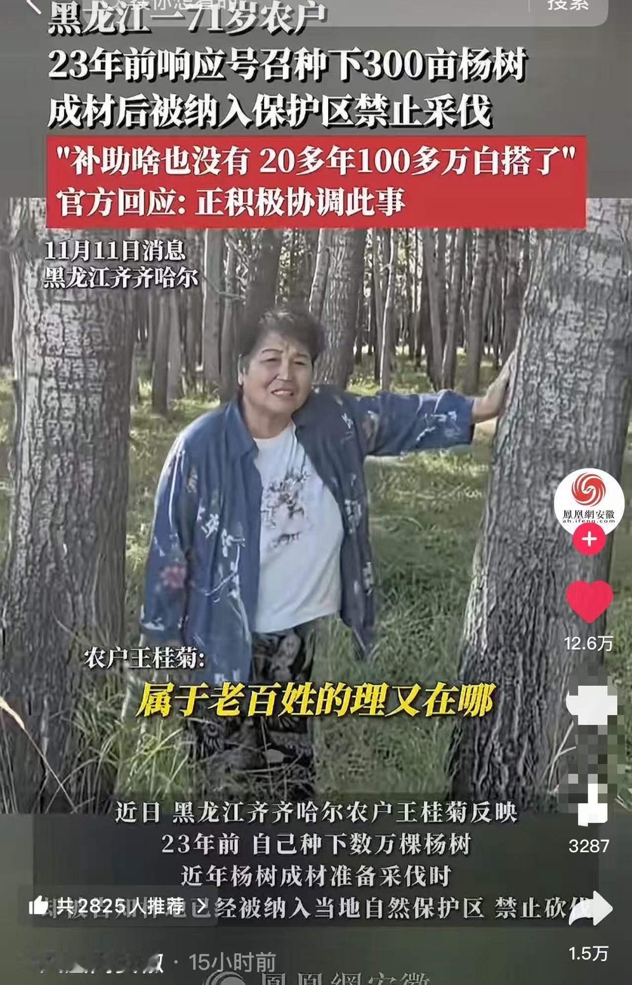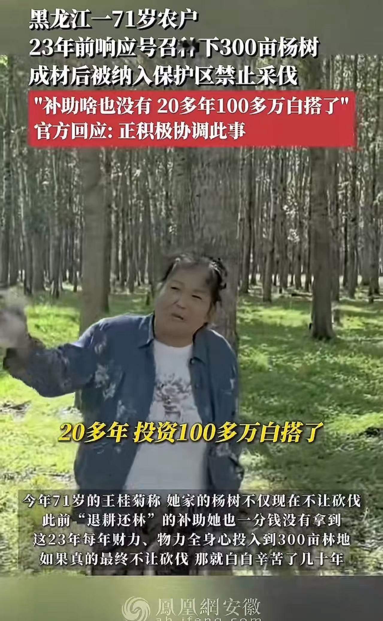 黑龙江,71岁农户23年前响应号召种下300亩杨树,成材后却被纳入保护区禁止采伐,一分补助也没有给农户!农户:“上哪里说理去!我20多年的投入,100多万白搭了!”官方回应:正积极协调此事! (来源:凤凰网)杨树种植 杨树采伐 种杨树规范 黑龙江,71岁农户的心声令人动容,也让我们看到了一个时代的变迁背后,那些被忽视的普通人。23年前,他响应国家号召,挥洒汗水,种下了300亩杨树,用自己的辛勤换来一片绿意盎然的未来。然而,命运似乎并没有善待他。成材后,他却被无情地划入保护区,禁止采伐,甚至连一分钱的补助都没有。面对这样的现实,他愤怒而无奈:“上哪里说理去!我20多年的投入,100多万白搭了!” 这不仅仅是一位农户的个人遭遇,更是一面折射社会变迁的镜子。我们常常在追求经济发展和生态保护的平衡中迷失了方向,忽略了那些默默付出、用青春和汗水铺就未来的普通人。这个农户的故事,令人深思:在保护环境的同时,我们是否也应给予那些为生态建设付出巨大牺牲的人一些理解和支持? 官方回应“正积极协调此事”,这是一种责任的体现,也是对公平正义的呼唤。我们相信,只有在充分倾听和理解的基础上,才能找到最合适的解决方案。毕竟,每一份投入都值得被尊重,每一份付出都应得到合理的回报。 这个故事激起了无数人的共鸣:我们每个人都曾为理想、为未来努力拼搏,也都希望在变革中得到公平的对待。它提醒我们,生态保护不是冷冰冰的政策数字,而是由无数像这位农户一样的普通人,用生命和汗水书写的绿色篇章。我们应当用更宽容、更温暖的心态去理解他们的辛劳,也希望相关部门能尽快妥善解决,让这份辛苦不再成为白白付出。 让我们共同呼吁:在追求美丽中国的道路上,不要忘记那些曾经用心血浇灌土地的人。只有让每一份付出都得到尊重,社会才能走得更远、更稳。这不仅是对一位农户的关怀,更是我们对未来、对生态文明的责任。因为,只有全民的理解与支持,才能让绿色梦想真正落地生根,开花结果。