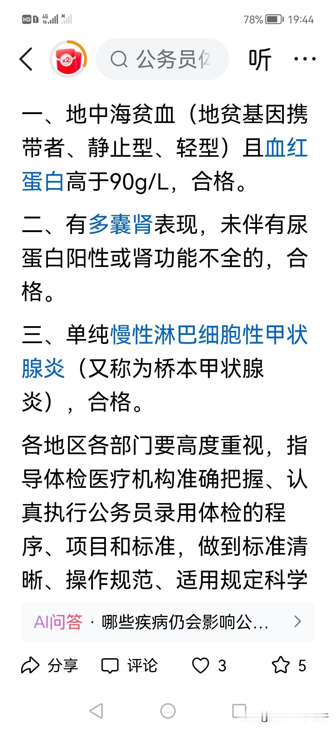 公务员录用体检标准调整了 考公的关注这个信息,中组办健康办公厅把公务员录用体检门槛下调了 地中海贫血现在应该也还好吧,不传染。 起码我知道有一年有个孩子就是桥本氏,她怕杭州体检太严,那个病似乎不是看指标,是医生手检查,我说的不一定准确,所以她放弃了杭州的第一。去的地级市。而地级市果真没有检查出来。 其实我也就得桥本氏不至于耽误工作。 这下公务员体检最重要的还是肝功肾功血压心脏,笔试过的可以先去预检一下