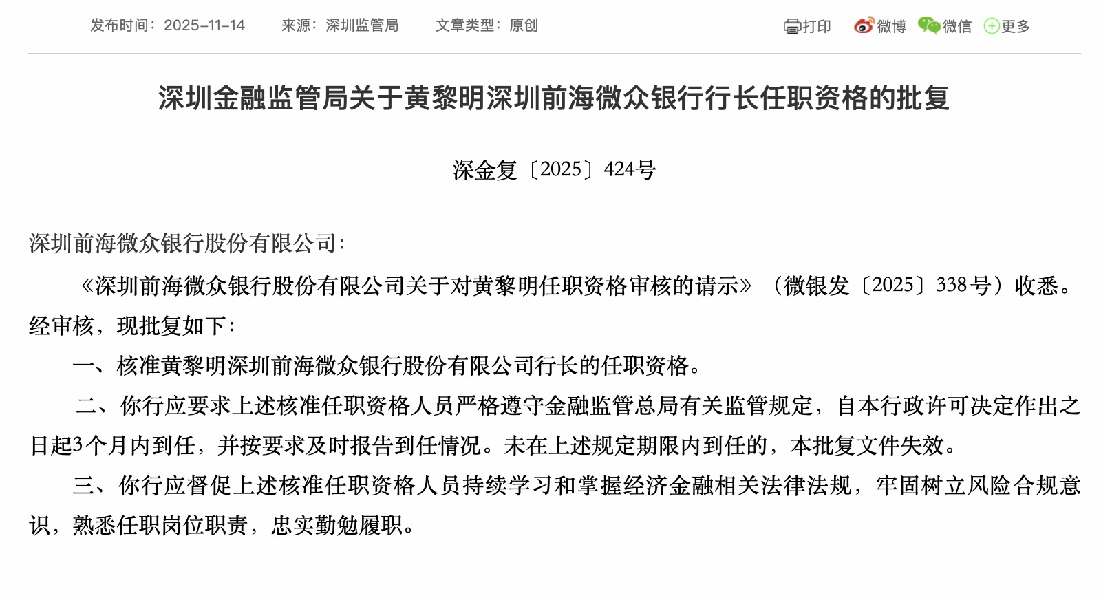 上证报中国证券网讯(记者徐潇潇)11月14日晚间,深圳金融监管局信息显示,该局已批复核准黄黎明深圳前海微众银行股份有限公司(下称“微众银行”)行长的任职资格。