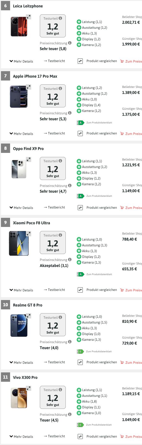 总而言之,OPPO Find X9 Pro 在与竞争对手的较量中毫不逊色,不过其价格也相差无几:在测试期间,其售价接近1200欧元。
