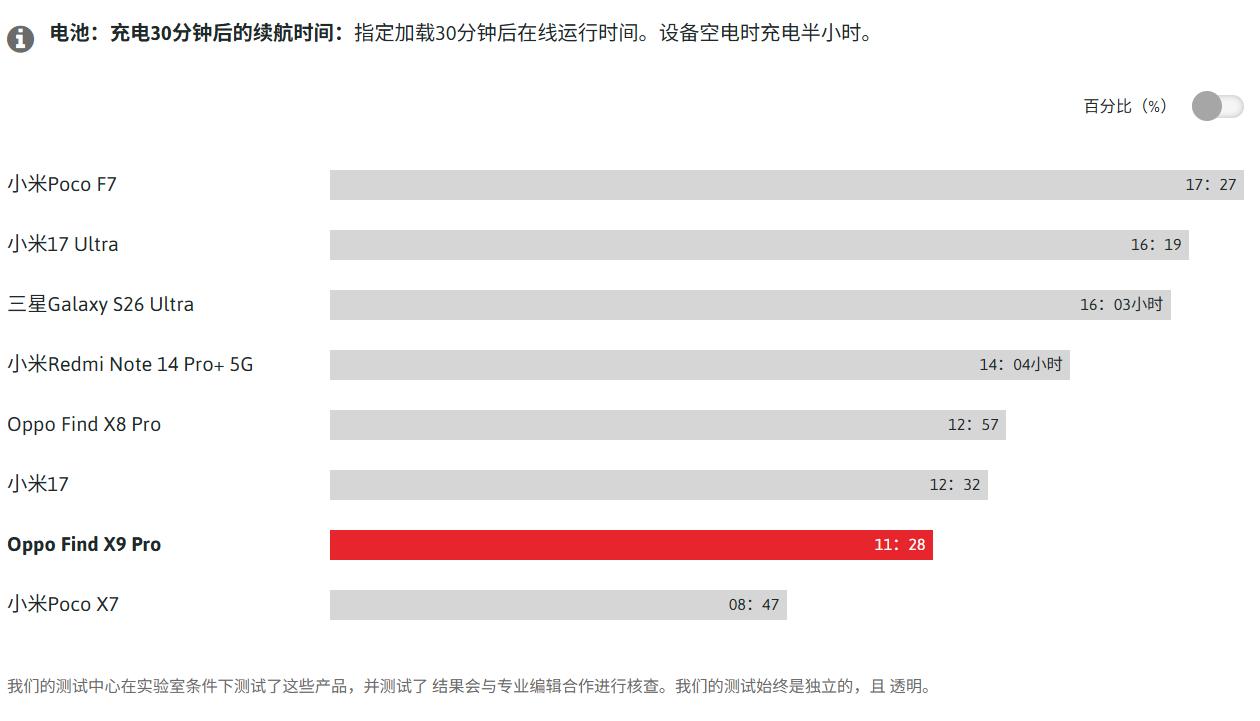 OPPO Find X9 Pro的充电速度颇为可观:使用电源适配器充电30分钟后,该手机又能够持续运行近12小时。