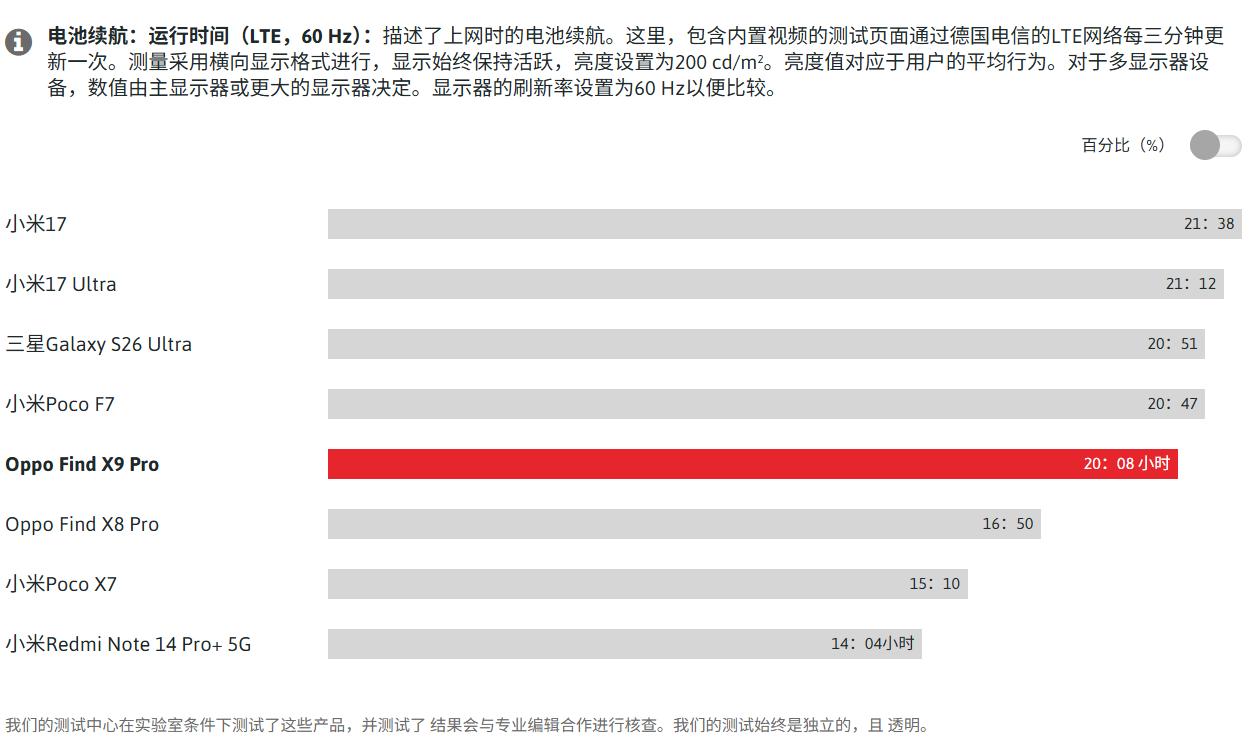 在我们所进行的续航测试中(固定屏幕亮度,60Hz刷新率),这款OPPO手机的连续使用时长成功突破了20小时。为我们提供了一个极具参考价值的对比对象:作为OPPO旗下公司推出的智能手机,一加15的电池容量为7300mAh,续航时间可达24.5小时。两者续航时长存在20%的差距,这可能由多种因素导致,但主要原因在于两款设备处理器能效的差异。